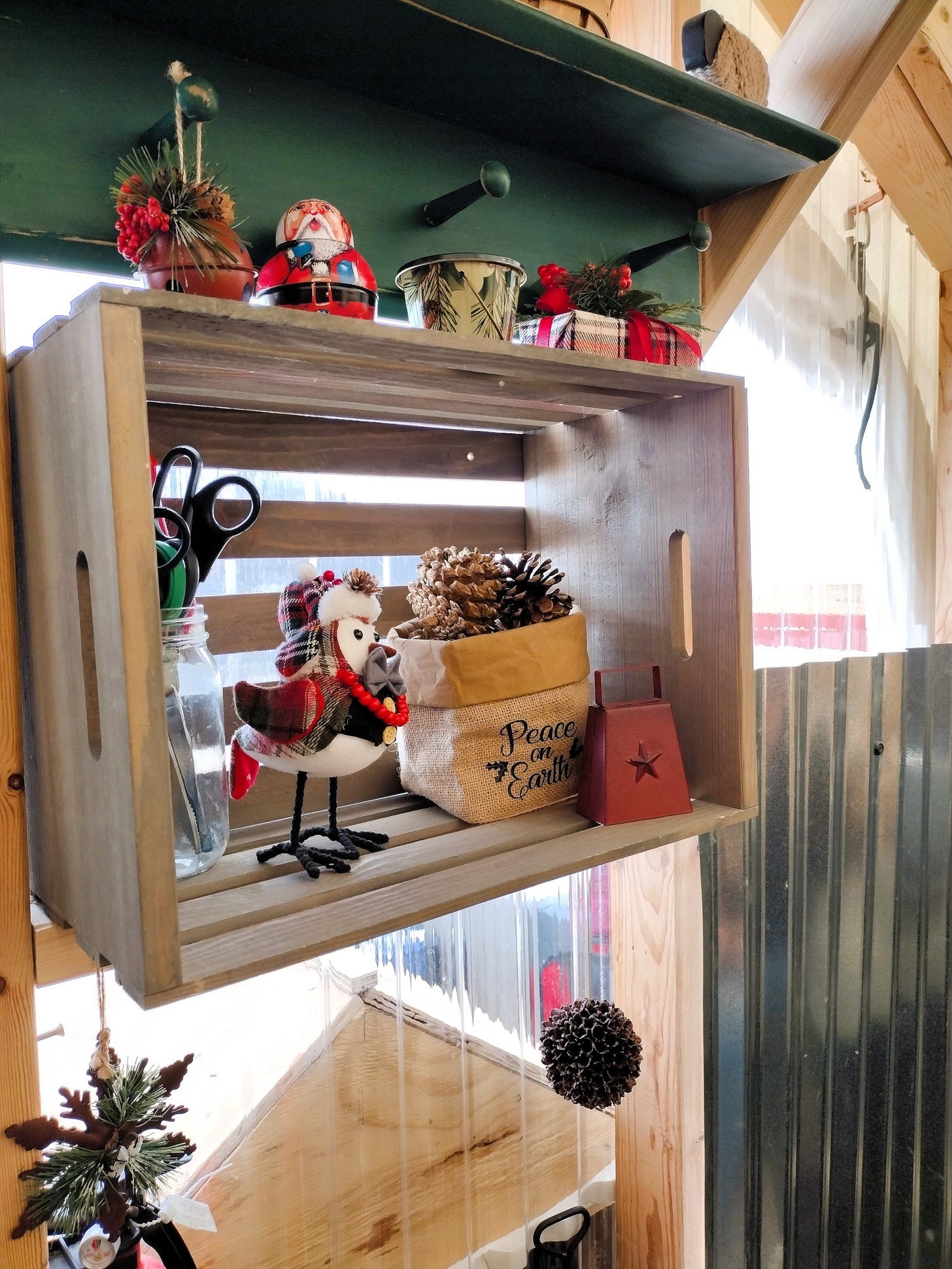 One evening, all of us ladies sat around our table to help my mom make the kids what our family has always called Christmas calendars. We wrapped 25 tiny gifts and glued them to a ribbon. The gifts are usually made up of candy or small toys. The kids get to open one each day of December as they count down to Christmas. My mom started making these for her little brother when she was a teen, and she has made them almost every year since -- for kids she babysat for, for us when we were little, for some of our friends growing up, and now for her grandkids. The calendars have changed over the years. When I was a girl in the 80s, they gifts were always glued to bright red velvety ribbon, but these days my mom opts for tasteful burlap bases for the presents. Being a part of making calendars has become one of my favorite holiday traditions. Since we have so little wall space, we created a small plywood wall on the side of the German Shepherd's huge stacking crates where the calendars could hang.