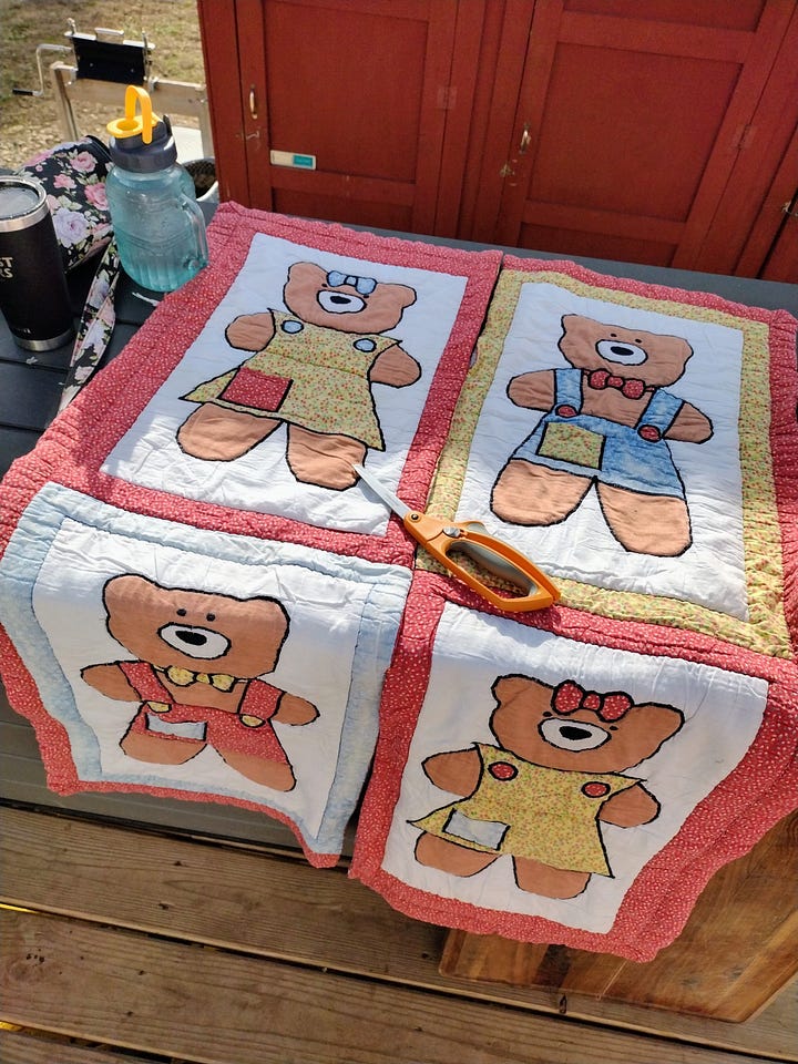 I winterized our bee hives on Thursday, removing the feeders and adding a little insulation. When we sorted through our keepsakes and moved them into the bunkhouse, I came across an old baby quilt my mom had made me before I was born. It had become quite faded and a bit torn, but I had kept it for sentimental reasons. As I was downsizing my keepsakes to fit into our new small space, I decided to repurpose the baby quilt. It has a thick cotton batting that will make for the perfect insulation for the tops of our Layens hives.