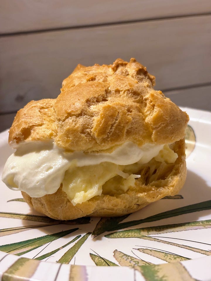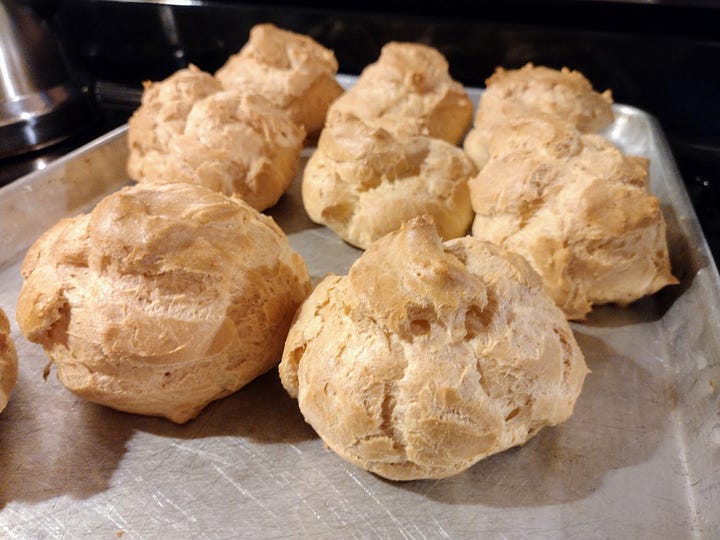 Our folks celebrated their 43rd wedding anniversary on Thursday. We young people gifted them a celebratory dinner. Our brother Jeremiah provided steak; Levi brought beer. We sisters made fettuccini alfredo and broccoli. For dessert, we made cream puffs — filled with homemade coconut pudding and whipped cream. It was quite the treat.