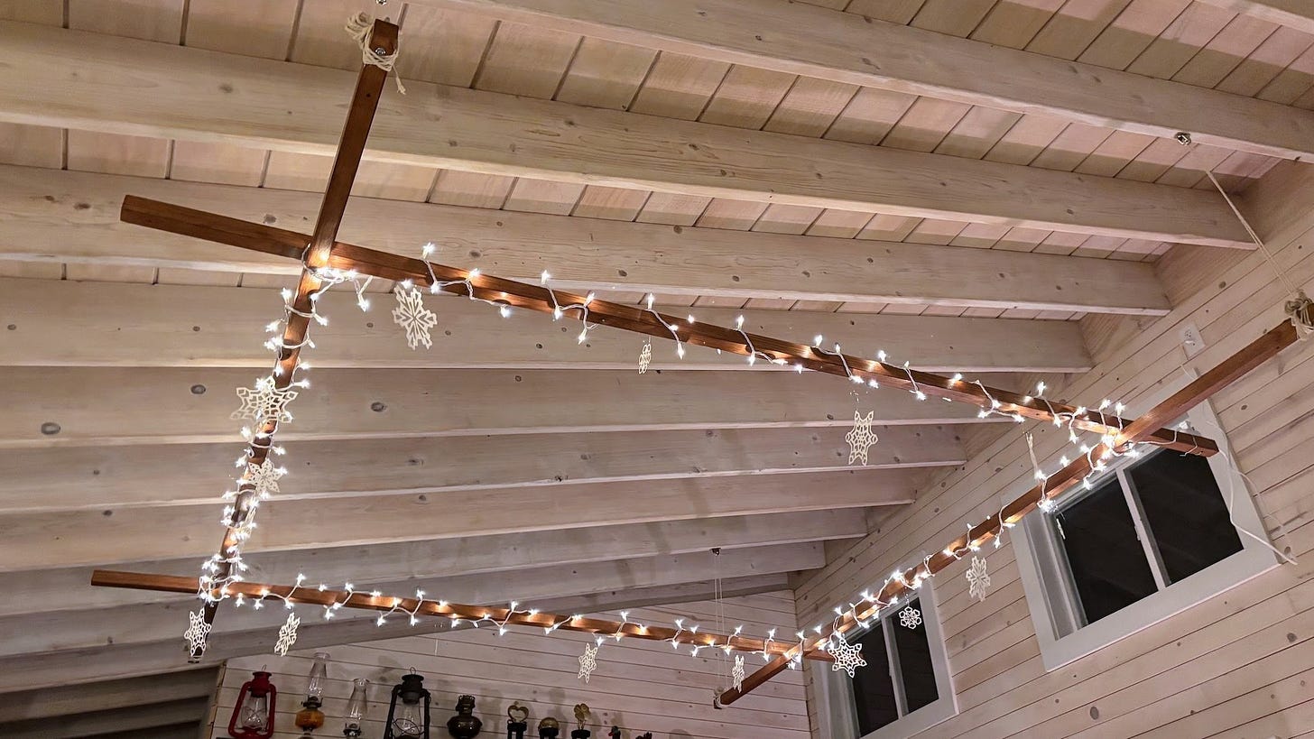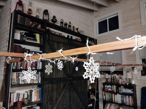 One afternoon when my dad was home, several of us finally hung up our old quilt frame. We had refinished it over the last couple weeks and ordered the hardware to hang it. Once everything arrived, we hung the frame in the living room. Since it will be a while before we have time for quilting, we wrapped the frame in twinkle lights and hung paper snowflakes from it. The effect is absolutely magical.