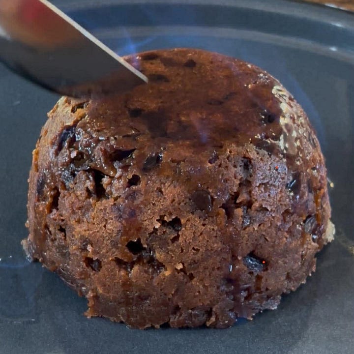 After weeks of waiting, we finally sampled the Christmas Pudding (Figgy Pudding) we made on Stir-Up Sunday. We served it in the traditional way — dousing it with flaming rum. We topped each slice with hard sauce (rum butter), and I have to say — I am a fan. It was so good — I’m already looking forward to making another next year.