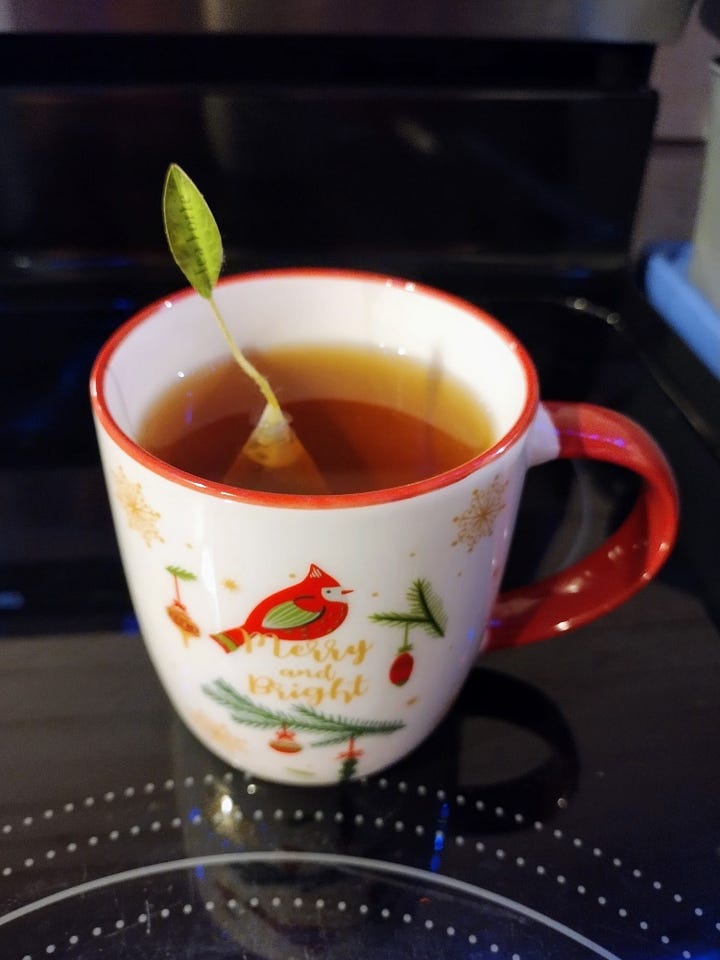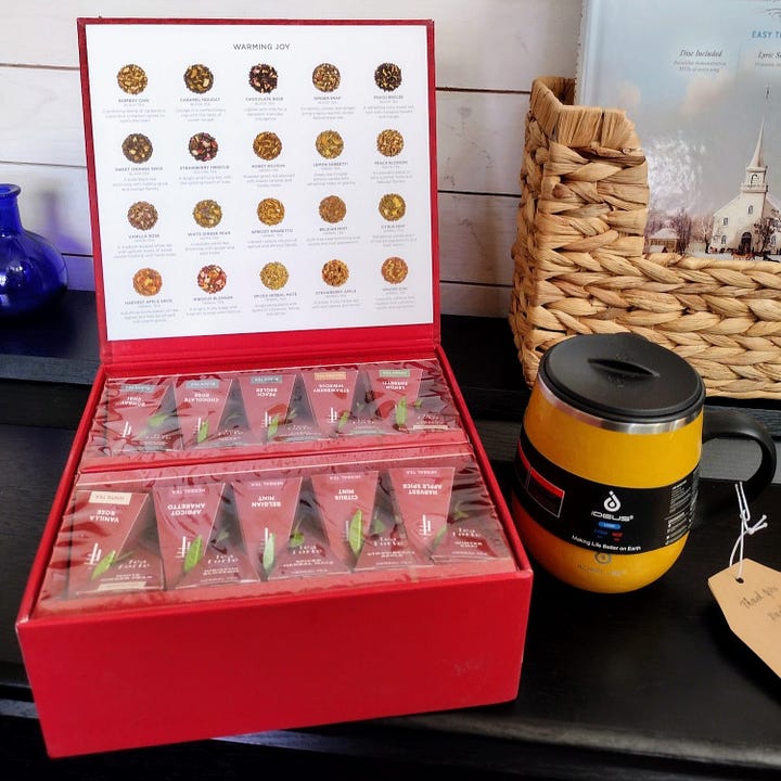 “Santa” knows me well, surprising me with a much-needed new thermos mug and a tea sampler. I put both to good use right away.