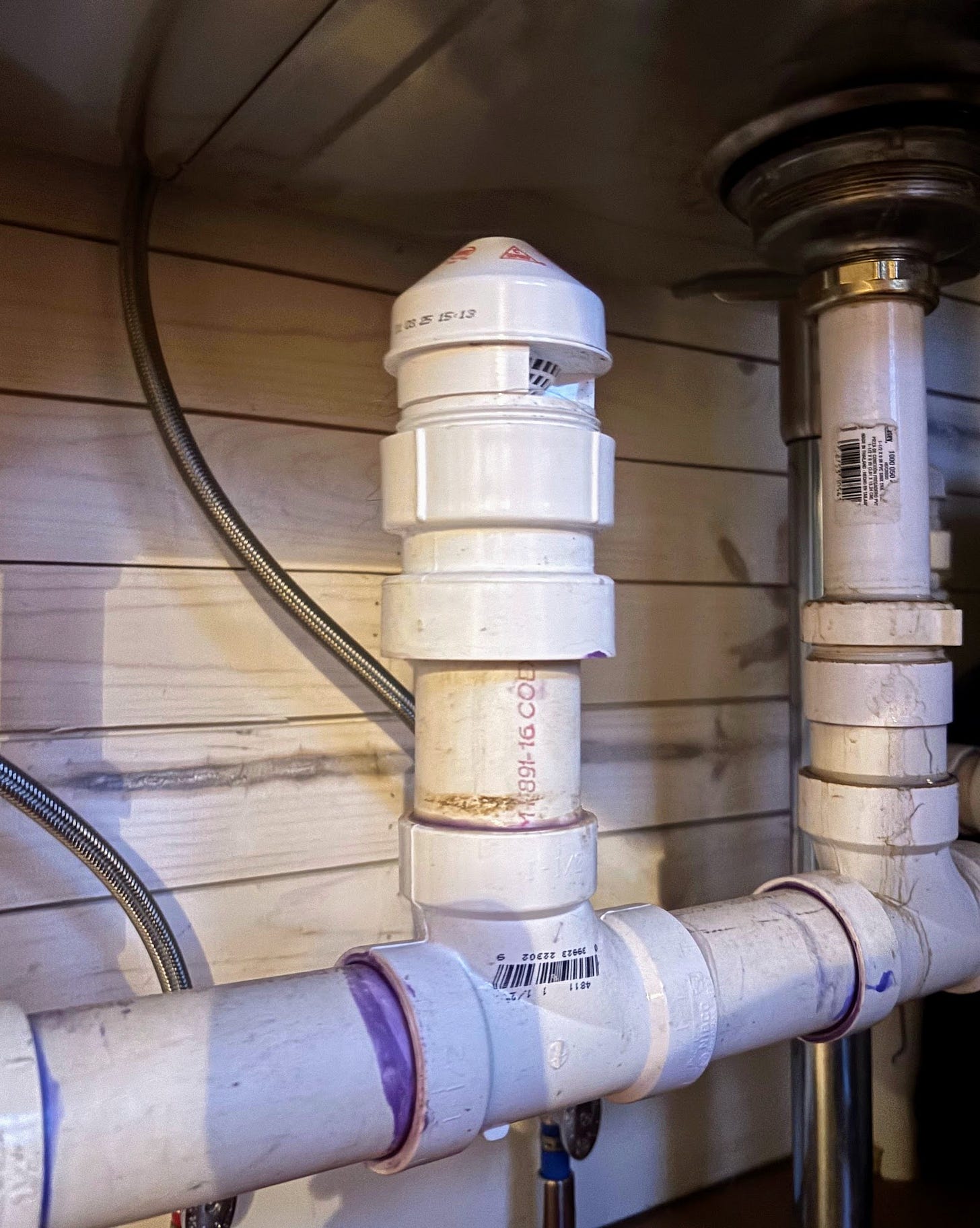 Our dad also installed an air admittance valve for the bathtub and a new one under the kitchen sink. We already had one on the back of the kitchen sink, but it wasn't draining properly. After some research, we realized we needed additional venting closer to the front of the kitchen sink drain system.