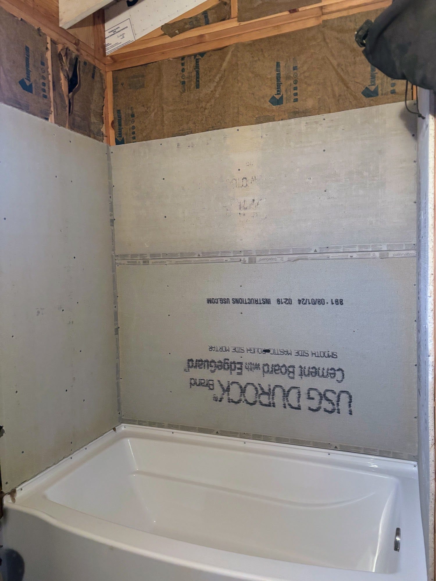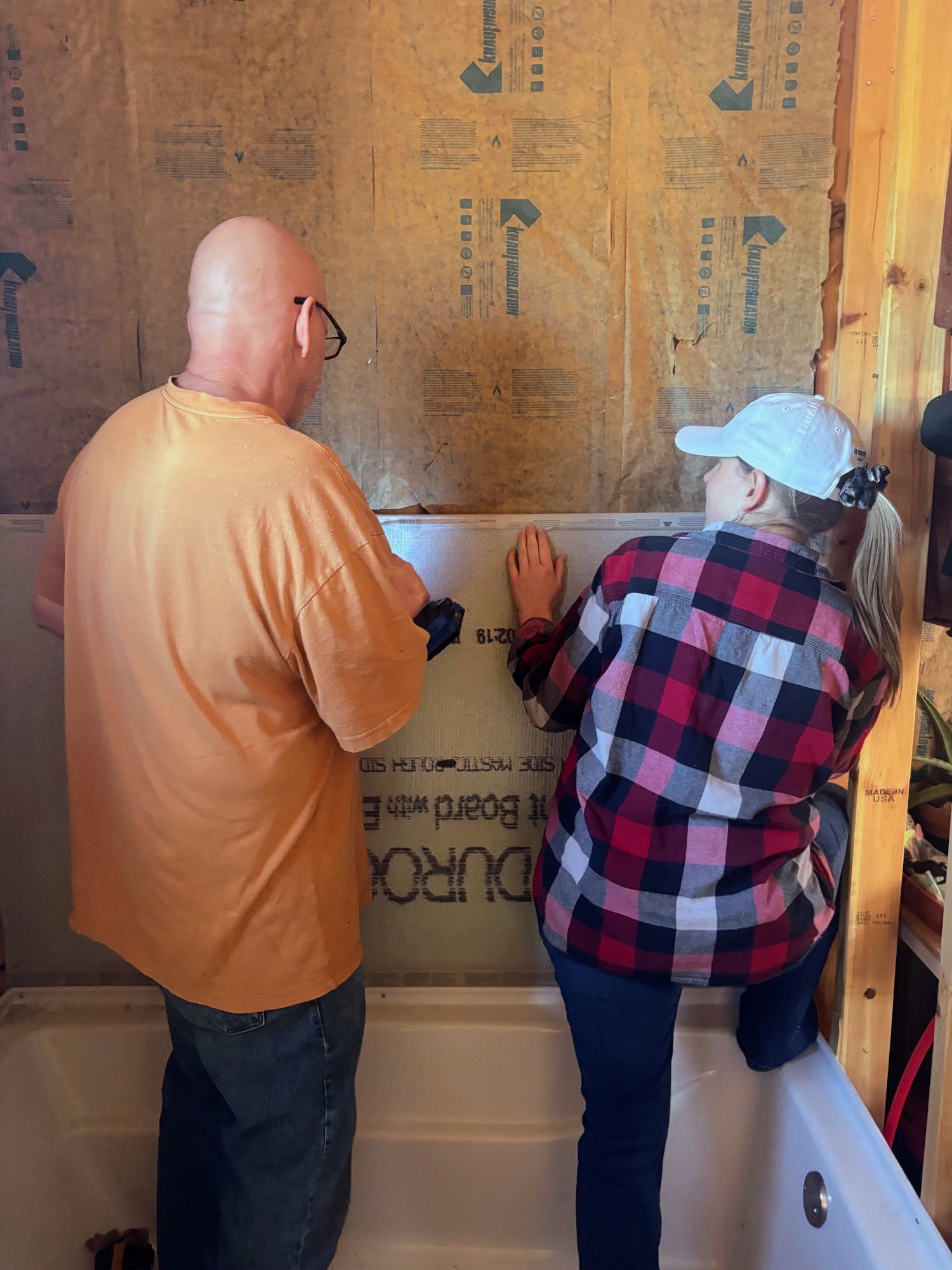 When our dad was home, we started on our bathtub surround. Our main goal was to put up the cement board so that we could side the rest of the room. After taking some measurements, we realized we needed to add blocking for the cement board, which we did.