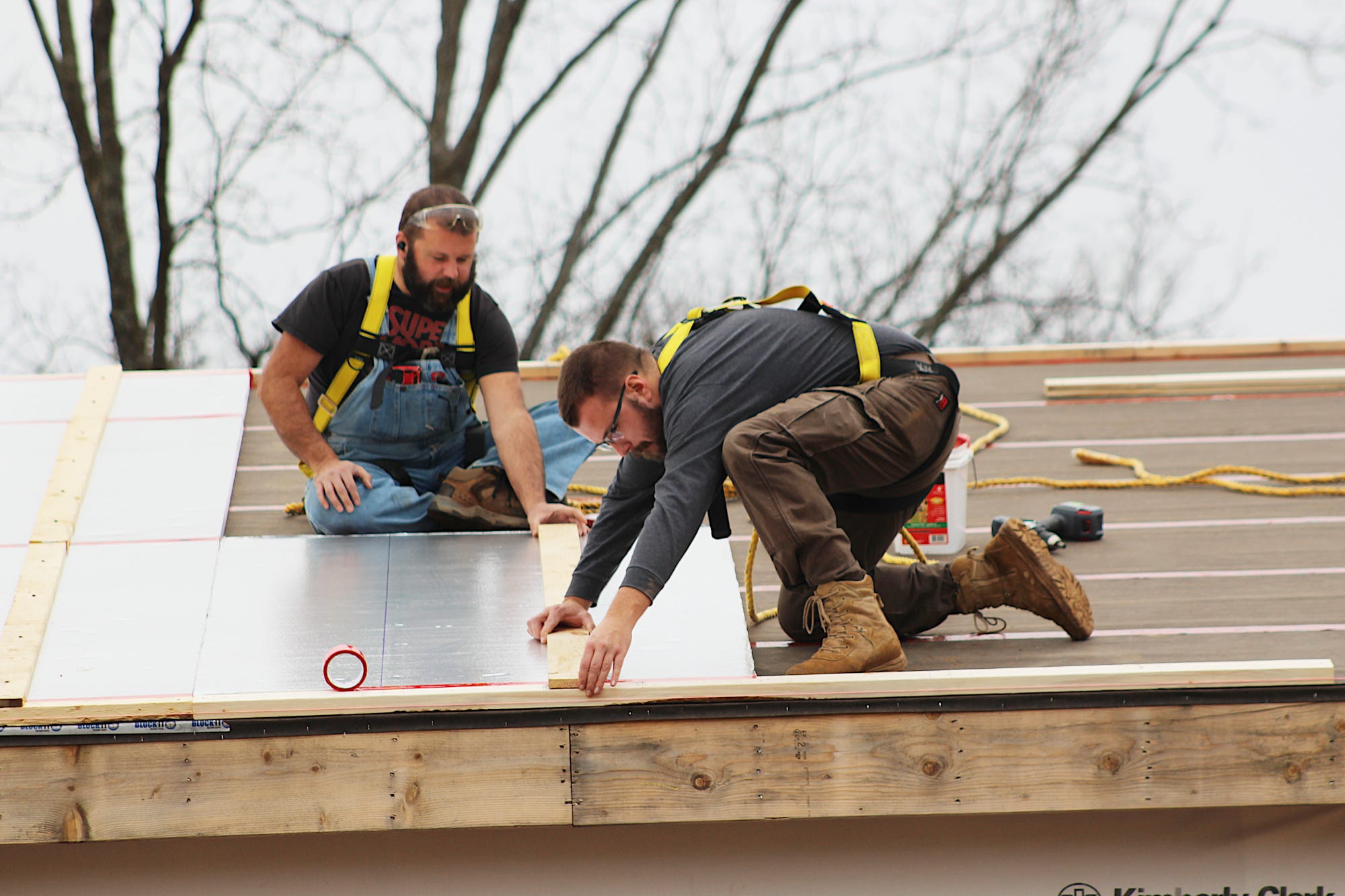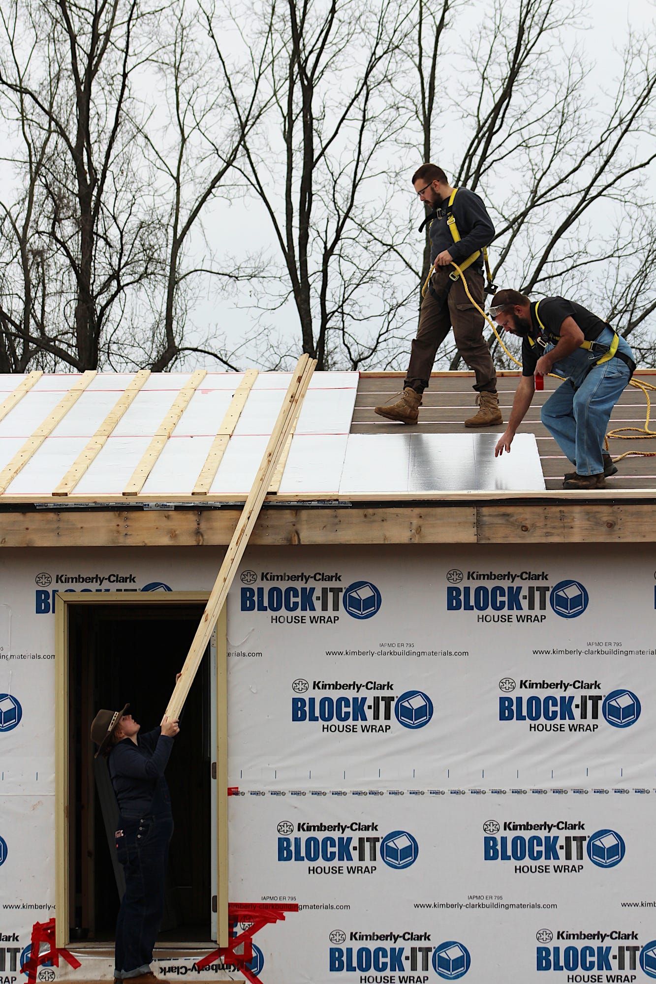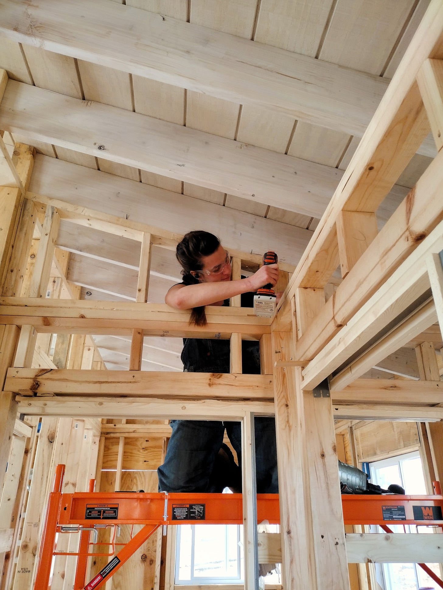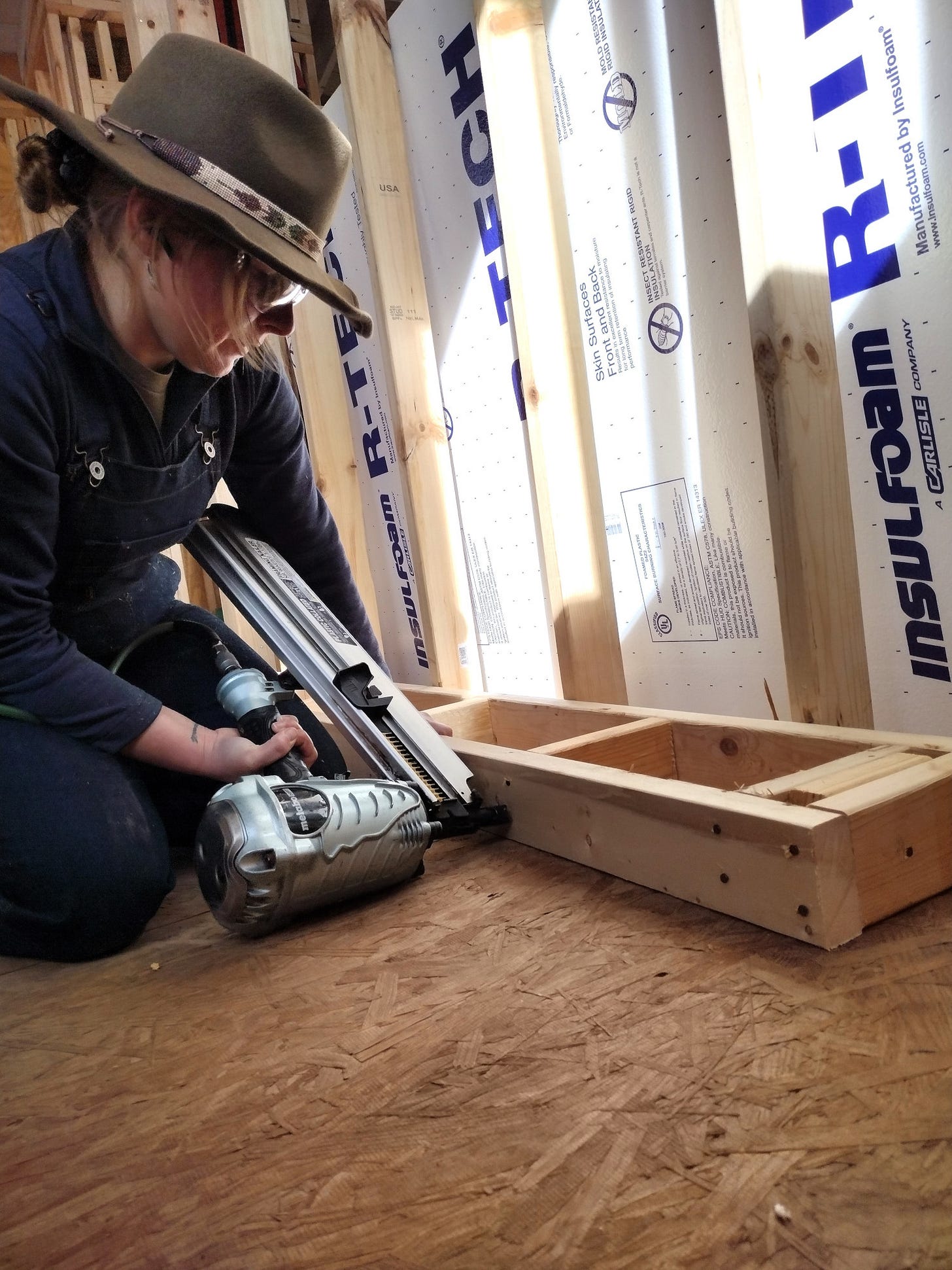 When the men were at work, we ladies worked in the bunkhouse. Grace and I prepped the last of the roofing insulation one day. We spent the rest of the time working on the rake walls. Some days we made a lot of progress, while other days we ran into issues that slowed us down. Warped boards made keeping the rake walls straight rather tricky, and we found ourselves fixing mistakes when we wanted to be moving forward. Still, by the end of the week, we felt good about our progress and our efforts.