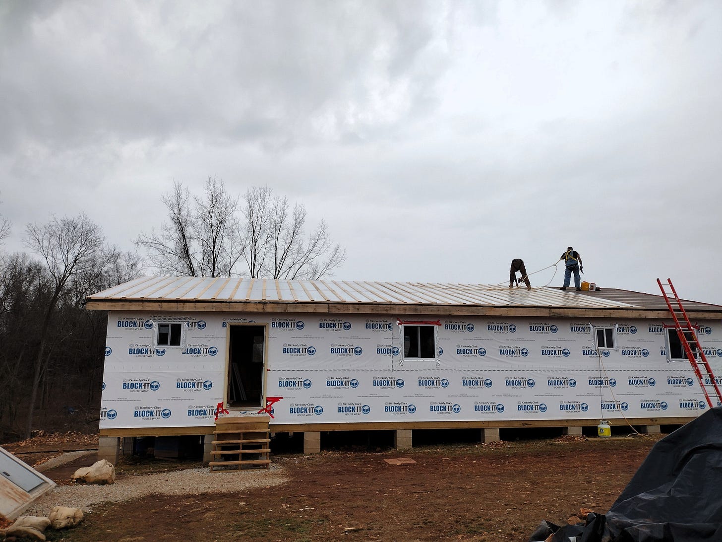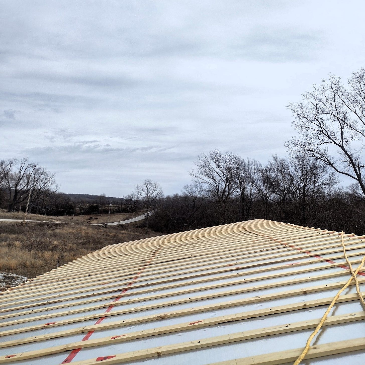 We made good progress on the bunkhouse roof this week, as our brothers Levi and Jeremiah spent last Saturday installing insulation. They finished most of the insulation, fastening the panels down with one-by-four boards. I stayed busy passing supplies up to them -- a task that felt easy at the time but left my arms sore all week. Grace and Levi finished the insulation on Friday. We were especially thankful for Levi, as the last portion of the project was particularly tedious. We had to screw down into blocking that was hard to locate. Levi's patience and long suffering in the face of numerous mishaps was impressive -- we couldn't have done it without him.