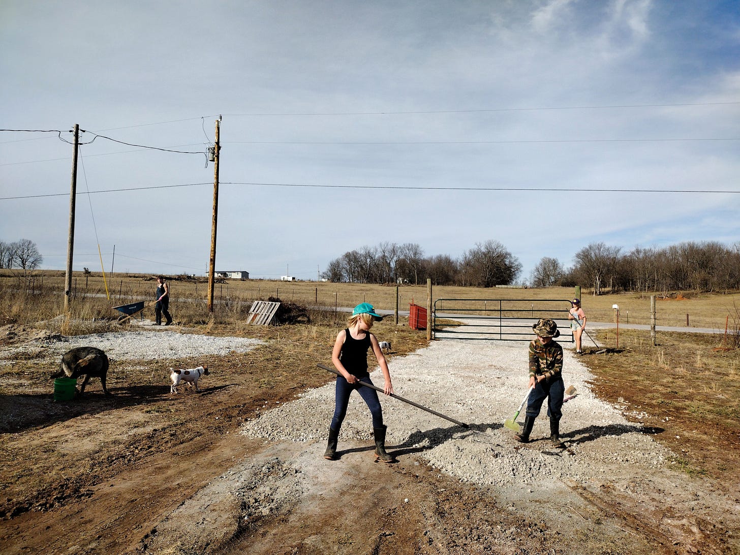 Bonnie-Jean and the kids spent a couple afternoons working on the driveway. The terrible mud we had a couple weeks ago was eye-opening, and we want to be more prepared next time.