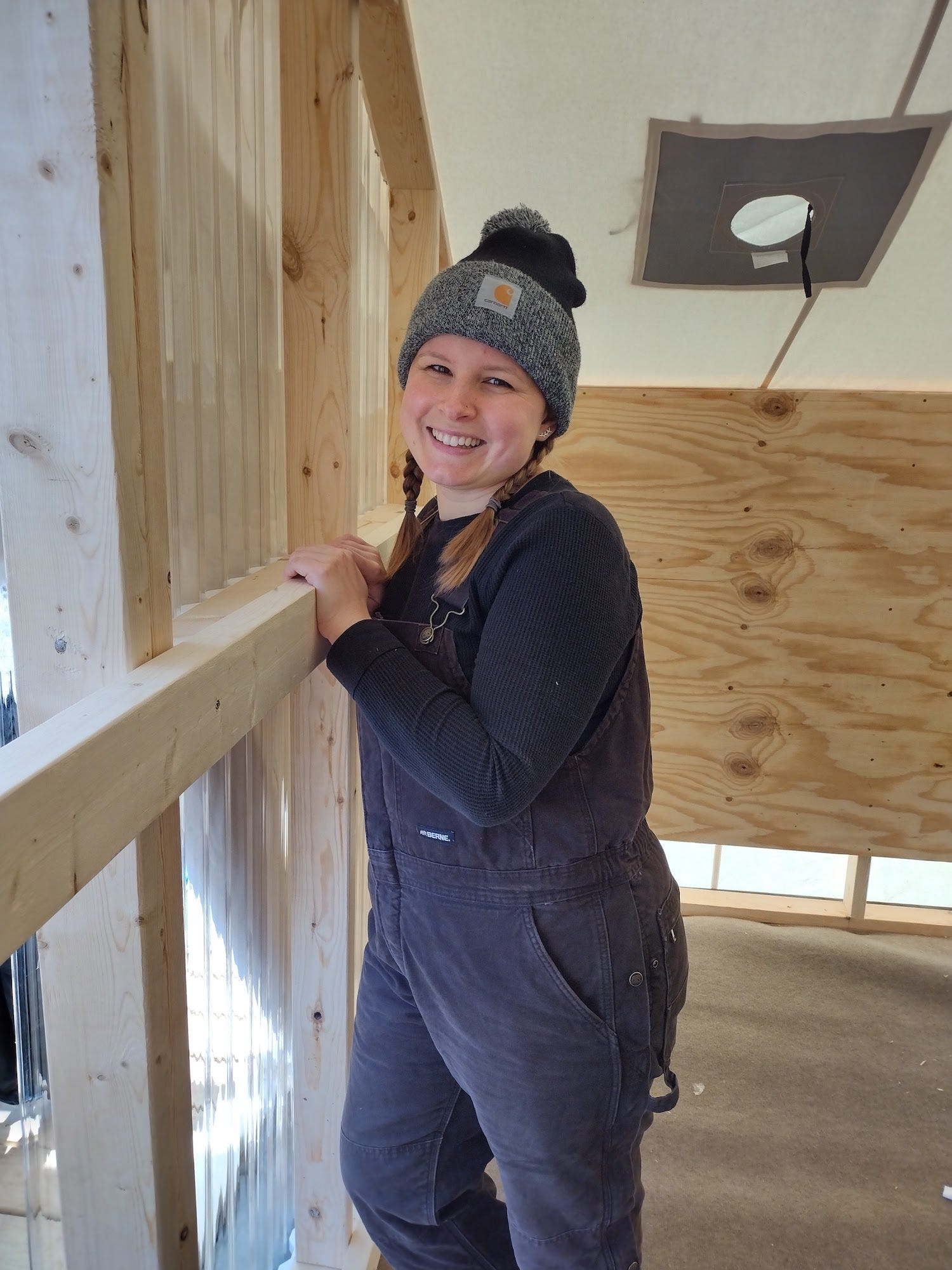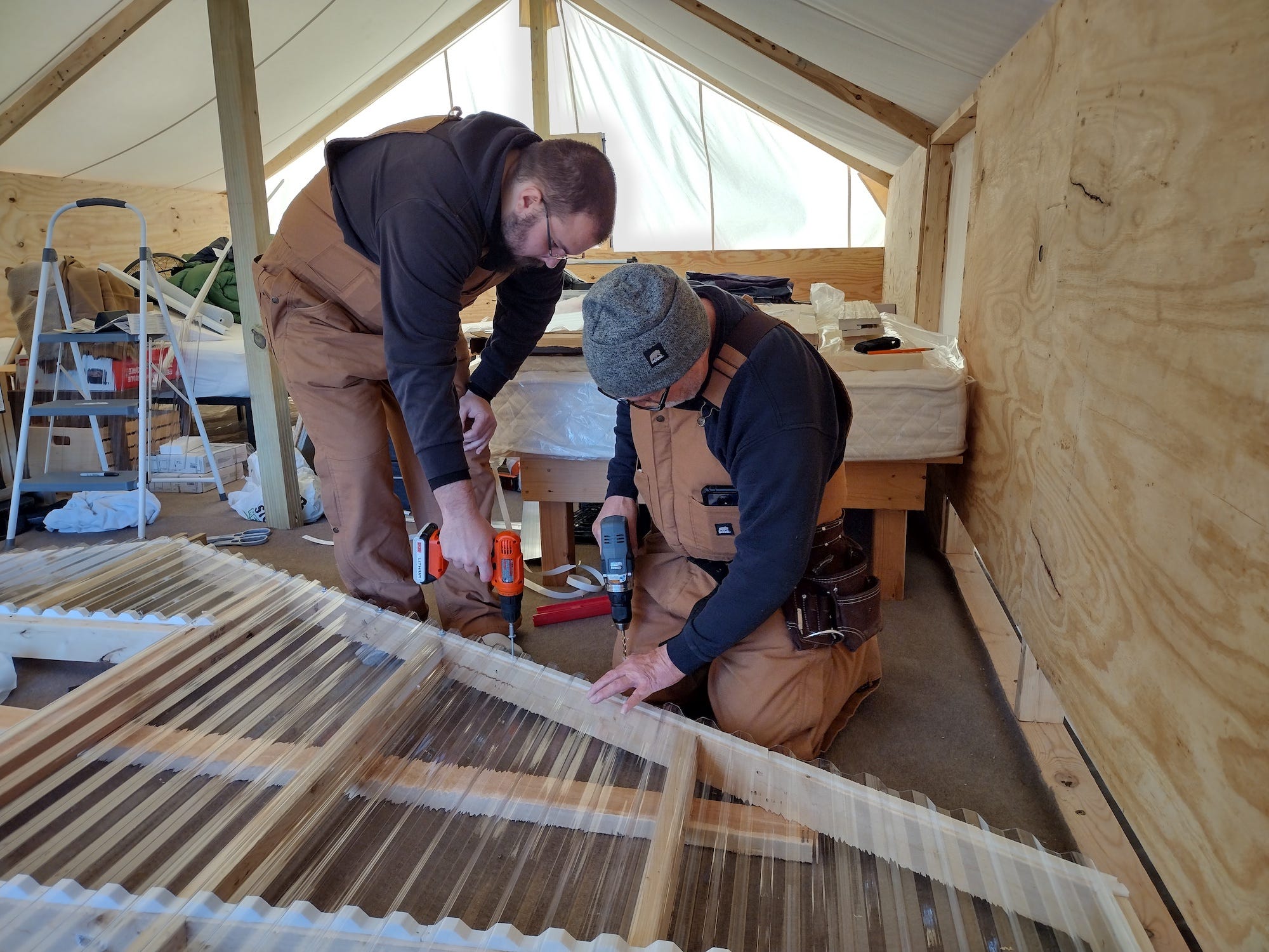 We had attached the polycarbonate panels to the wall only along the top, as we knew there would be a lot of movement during the positioning process. After we got it up, we finished attaching panels to the frame.