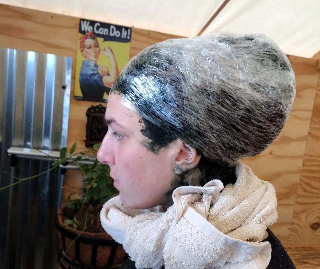 On Monday, we celebrated Grace's birthday. We gave her a day off to just relax -- something that never happens around here, even on the weekends. In the afternoon, Bonnie-Jean dyed her hair darkest brown with a natural indigo treatment. In the evening we all indulged on Domino's pizza, sugar-free pina coladas, and chick flicks on the projector.