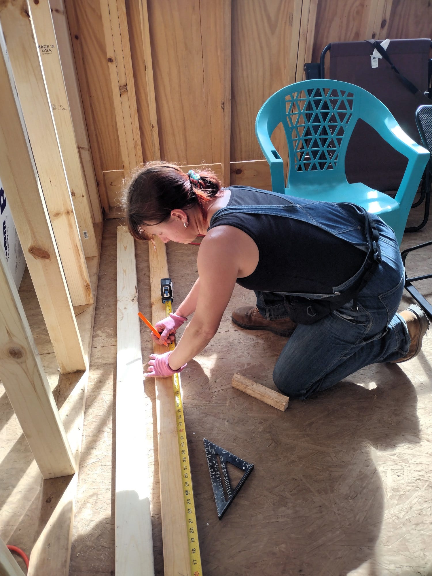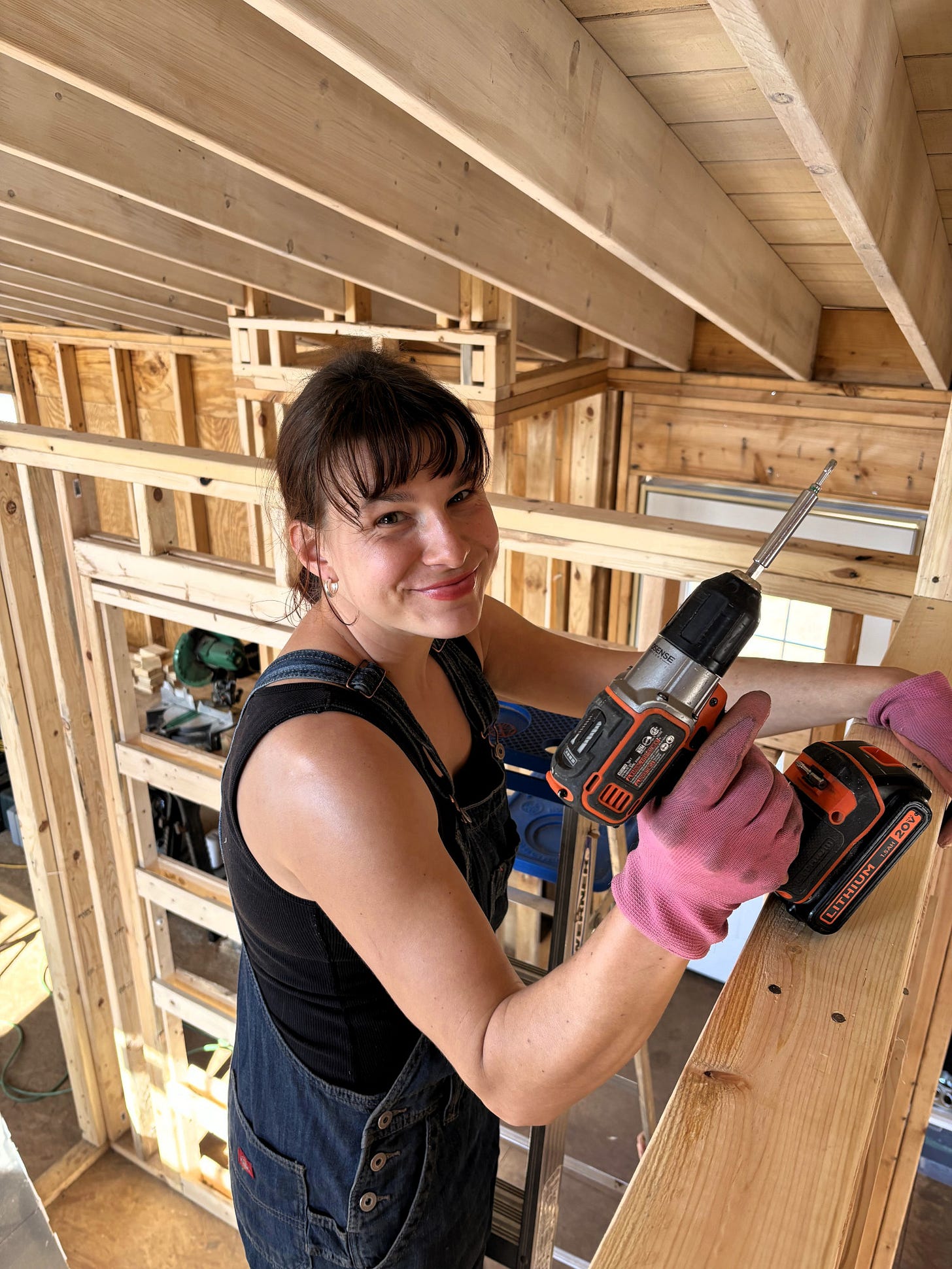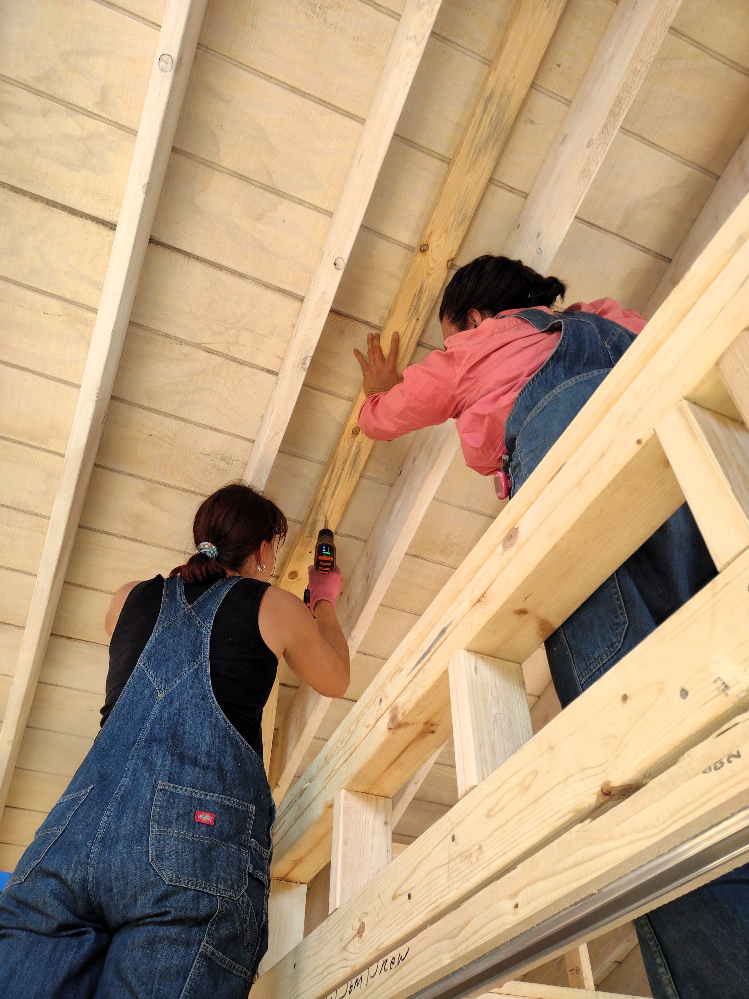 The longer, warmer days have made for an adjustment to our routine, as we can start earlier and work longer. It feels good to race the sunrise in the morning, to fetch breakfast beneath the pink dawn, and to start in the bunkhouse with the day still sparkling and new. While our progress continues to be slow -- the extra couple hours of work make all the difference. It was another week of roof and rake walls. Levi worked on the roof yesterday, attaching purlins until we ran out of wood. We knew this would happen at some point, as we had some loss to termites. We sisters spent most of the week continuing with the rake walls. We aren't sure why we have struggled so much with this particular job, but thankfully we are almost done. We just have one more wall of studs, which we should finish early next week.
