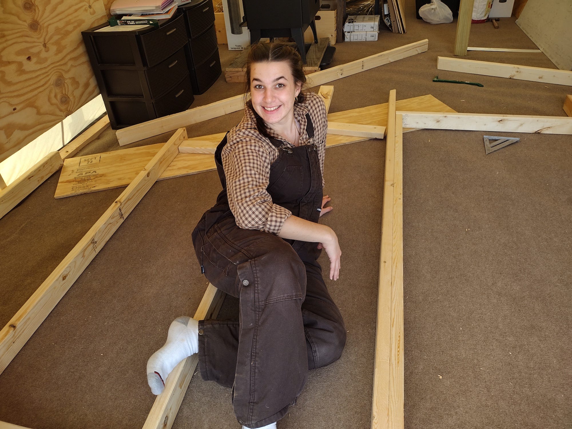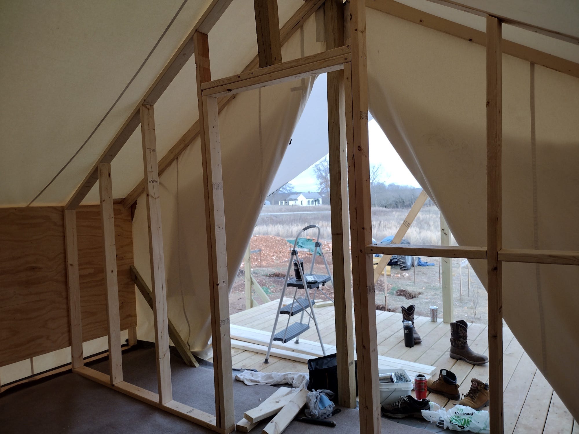 We did our best to make progress, despite the germ and polar vortex. We only made it out two days, but we got quite a bit done. Like many other canvas tent campers, we decided to build a simple wood and polycarbonate wall across the front of our tent. This will allow us to use a real door, which will make life much nicer with up to 11 people sleeping in the tent at times. We have the wall framed and started on the sheathing. Lord willing, we will finish the wall and build the hearth next week.