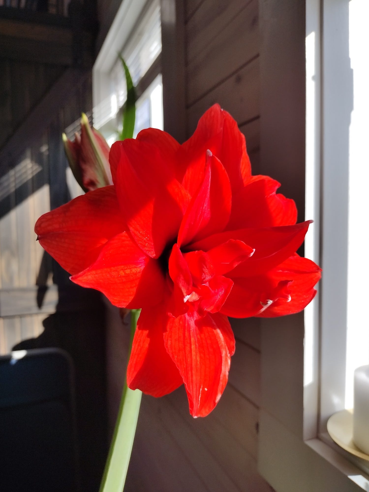 Yesterday, my very belated Christmas amaryllis bloomed. I knew I had forced both of our amaryllis plants dormant too late in the year. So far, only this red one is blooming. It’s lovely, and very much worth the wait. It makes me ready for spring and the flowers that will unfurl beauty across the landscape. Seasons change — tax season with all the rest. I’ll be glad when this one is finished. There are so many new seasons to look forward to.