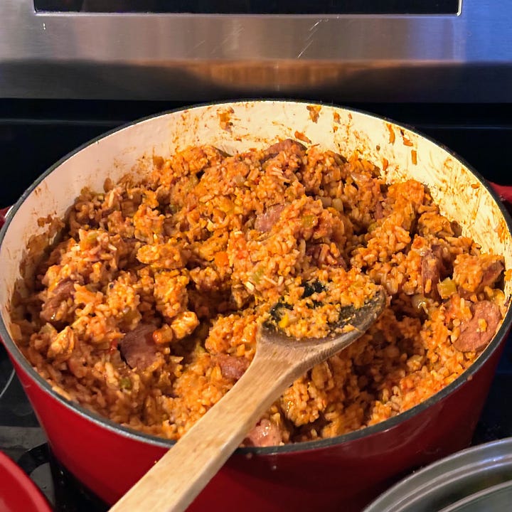 Lent — the Christian season of fasting and penance — began this week. On Tuesday, we had a little Mardi Gras dinner — jambalaya, southern-style corn, and greens.