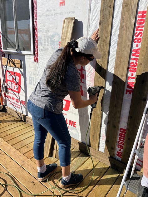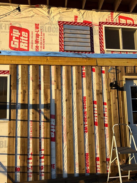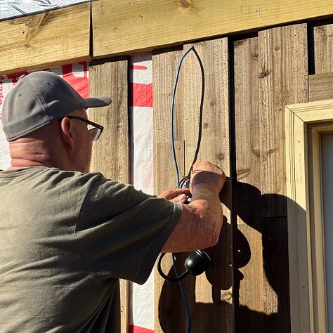The weather was finally nice enough this weekend to spend some time outdoors. On Friday, our dad, Grace, and I worked on exterior siding. It felt so good to be working in the sunshine. We installed the siding around our porch light electric box first, and our dad wired the light. After going without one for so long, having an outdoor light on our deck feels like such a treat.