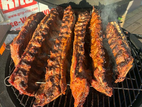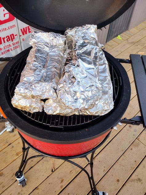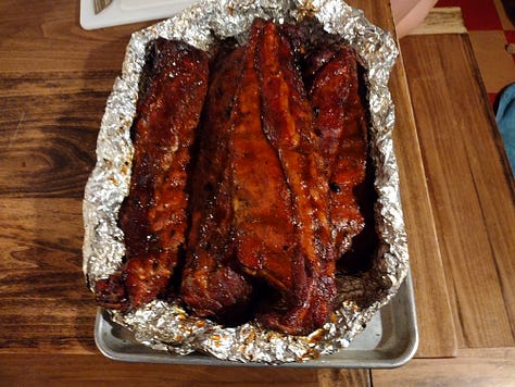 When I wasn’t cooking yesterday, I helped our brother Jeremiah smoke some baby back ribs on the Kamado Joe grill he gave the family for Christmas. We tried the 3-2-1 rib method, which was somewhat complex. We started by coating the ribs with mustard and a rub, then smoked them for three hours. Then we wrapped the ribs in foil with some of our home-brewed Irish ale and continued smoking them for two hours. Finally, we moved the ribs into a foil boat with honey barbecue sauce for the final hour. They smelled so good all day. And when we finally tasted them, they were melt-in-your-mouth delicious. We will definitely be smoking ribs again in the future, though next time our brother wants to invest in a rib rack and rack extender for our grill.