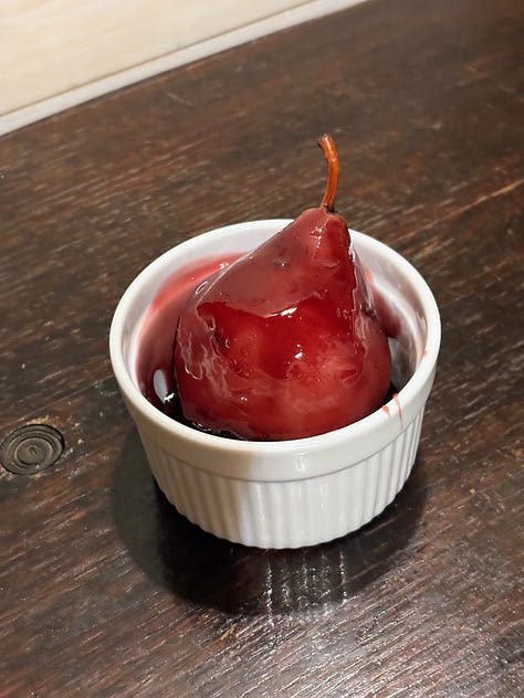 Monday was Candlemas or the Feast of the Presentation of the Lord (commemorating Mary and Joseph presenting Christ in the temple). In France, Candlemas is known as crepe day, so we had savory crepes filled with chicken and broccoli for dinner. We served them with a simple bistro salad and wine-poached pears.