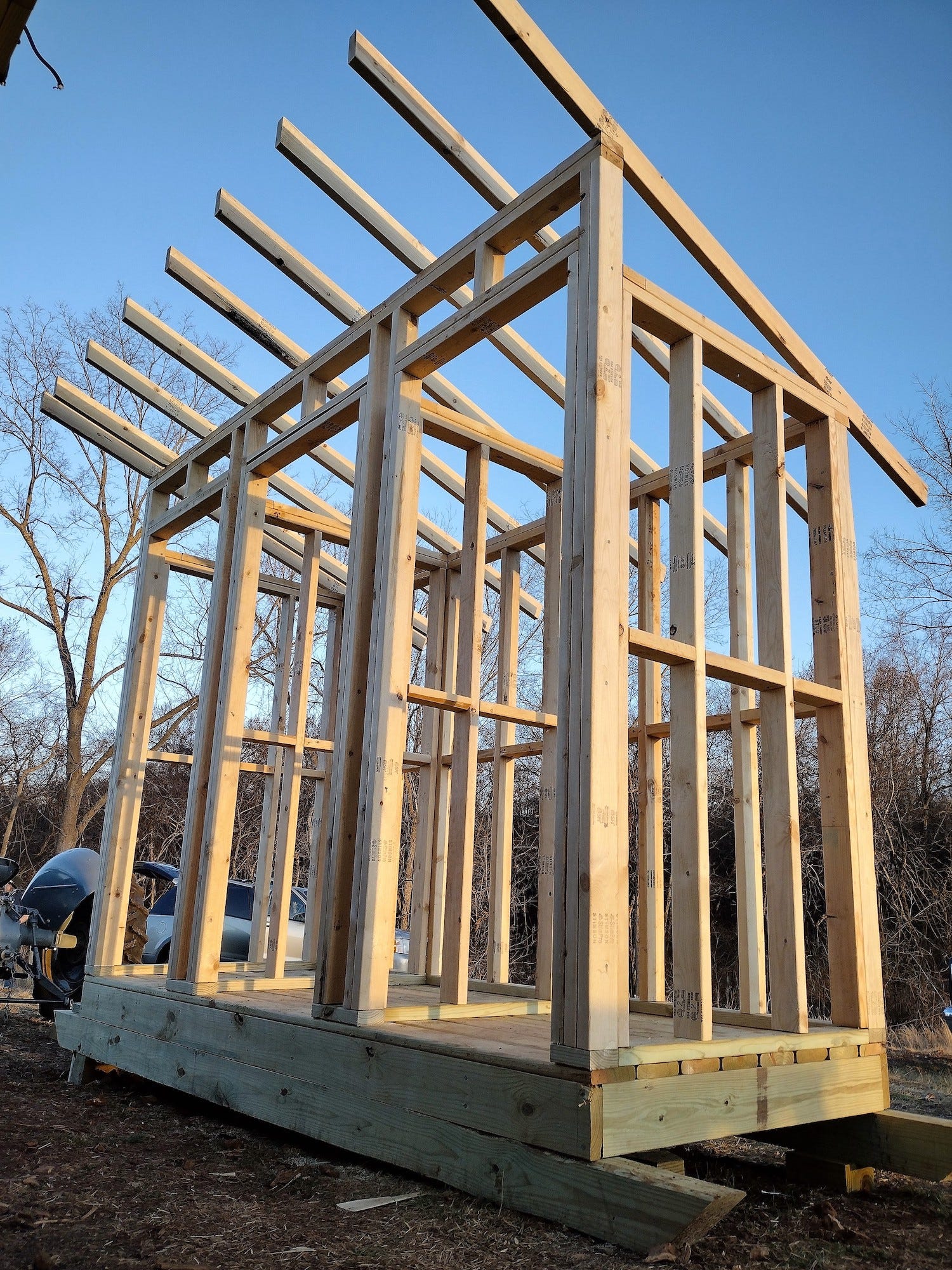 Last Saturday we assembled the shed walls and finished cutting and installing the rafters. It was exciting seeing it all finally coming together.