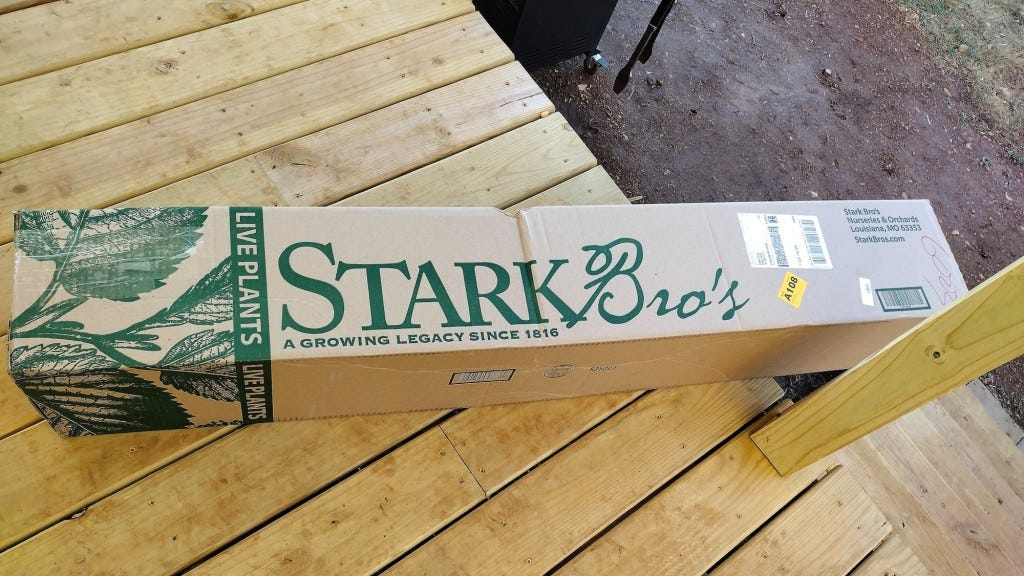As we were wrapping up for the day, we had a surprise delivery from FedEx. We had been told our apple trees (family Christmas gifts from our brother Levi and his wife Erin) were arriving in April or May, but -- they're here!