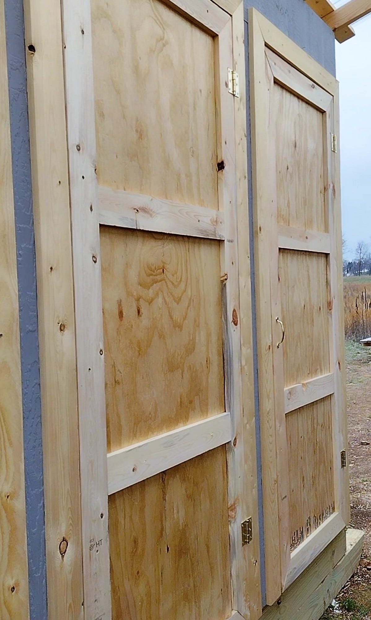 We have had lots of rain this week, which is a blessing in general. But it meant that, once again, we only had one full work day on our project. We finished the shower shed doors and hung them up -- leaving a little bit of hardware to finish installing next time.