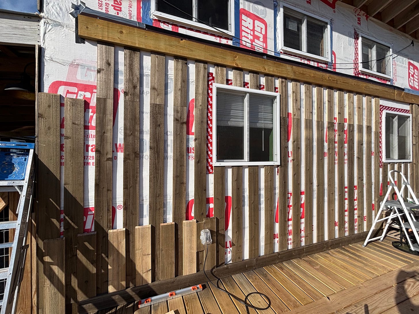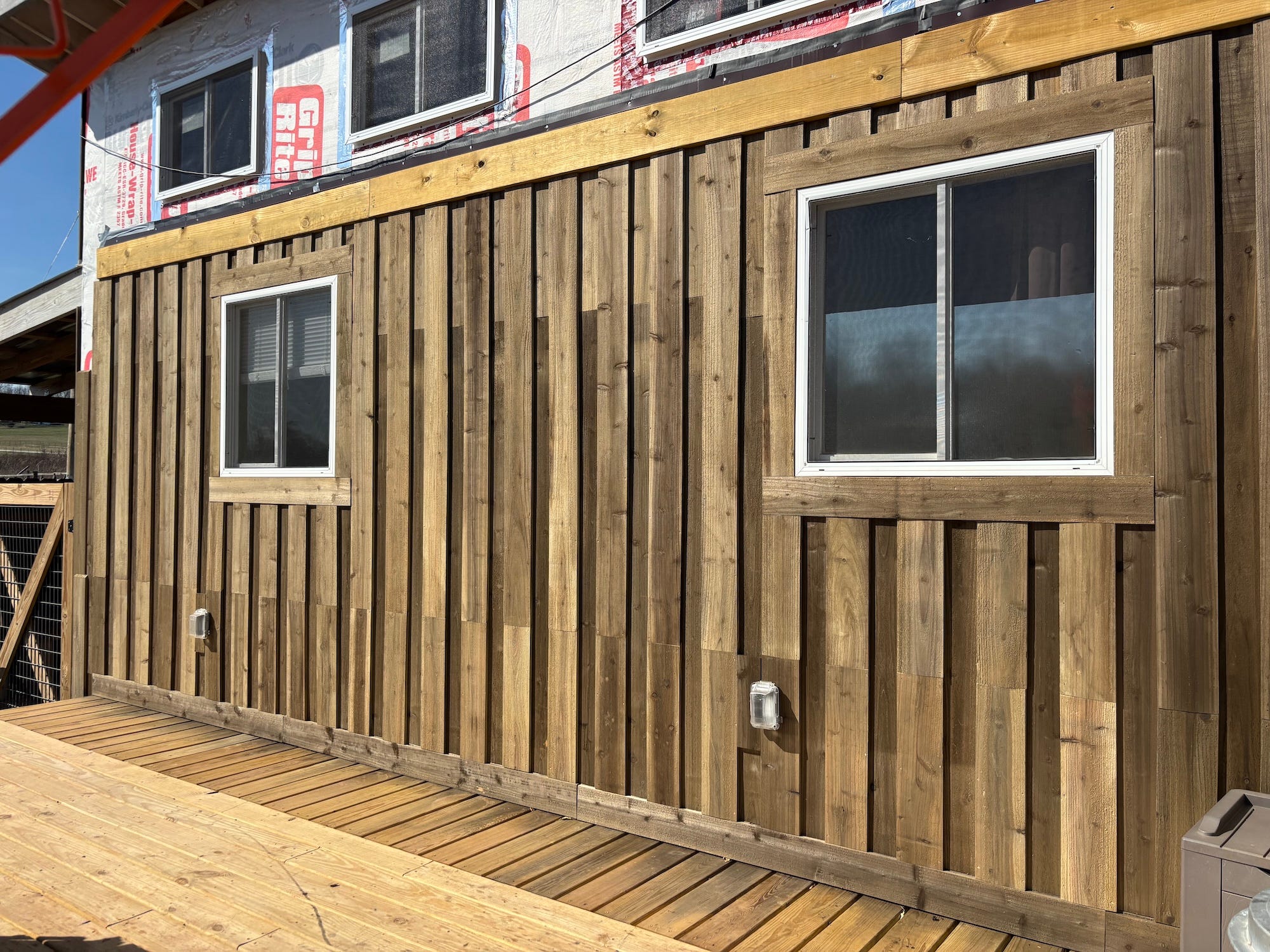 Grace and I worked on the exterior siding for a couple days. Our brother Jeremiah helped on his day off, making a lot of progress. We went through so many boards, Grace had to quit siding and treat more boards with Eco Wood Treatment.
