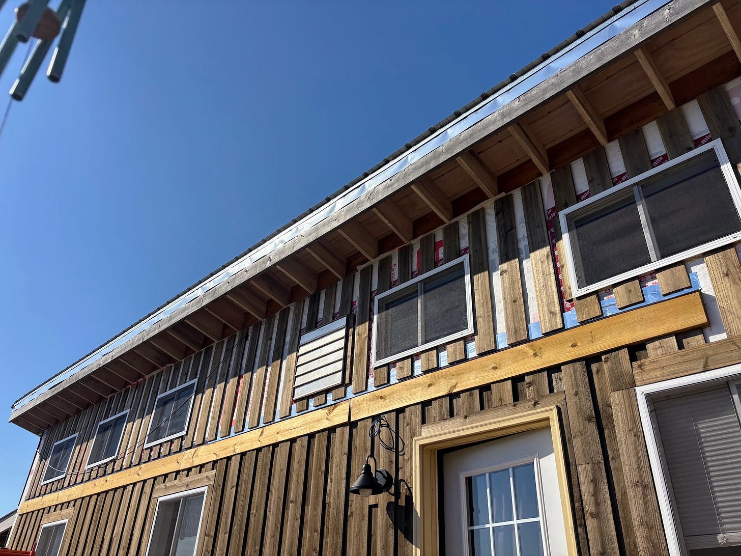 Yesterday, our brothers made significant progress on the exterior siding. They installed a whole layer on what is left of the bunkhouse.