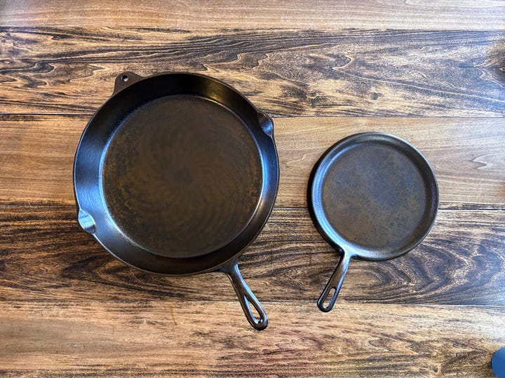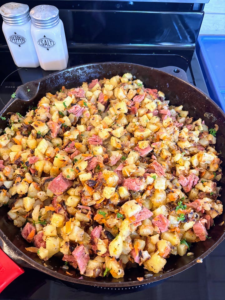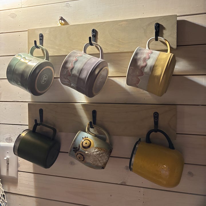 The cold gave us a good excuse for a slow start to our week. We stayed busy inside with holiday cooking and indoor projects. We put together a small cup rack for the room we sisters share, as we keep our personal mugs there. We seasoned the cast iron pans Grace had stripped last week. We used the method we landed on several years ago, last time we re-seasoned our pans — using the oven and grapeseed oil. We had the pans in great shape when we moved out here, but two years of camping had led to significant rusting (they had gotten wet, unbeknownst to us). We got our very-large family skillet finished just in time for our annual St. Patrick’s Day breakfast — corned beef hash.