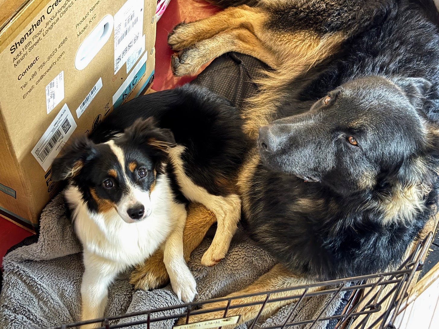 Thursday and Friday ran together. I worked on sanding the cedar for our bathroom, then the flooring for we sisters' room. In between, I sprayed coats of paint onto our door. Grace worked in the bunkhouse, caulking blocking and painting trim, while watching over her mini-Aussie, Milly. Since Tilde is so busy with her puppies, Milly has gotten very chummy with Dagger.