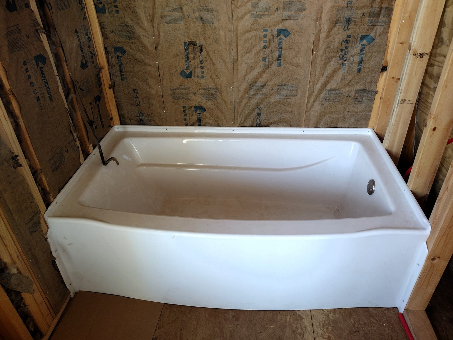 On Saturday, Levi and our dad installed the bathtub. It took them a good chunk of the day to install the drain, put down the adhesive, level the tub, and secure it in place. After that, Levi hooked it up to the rest of our drain system.