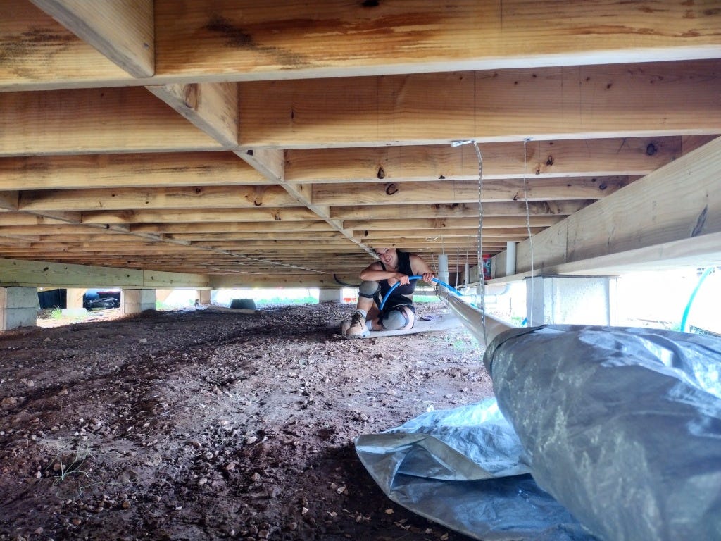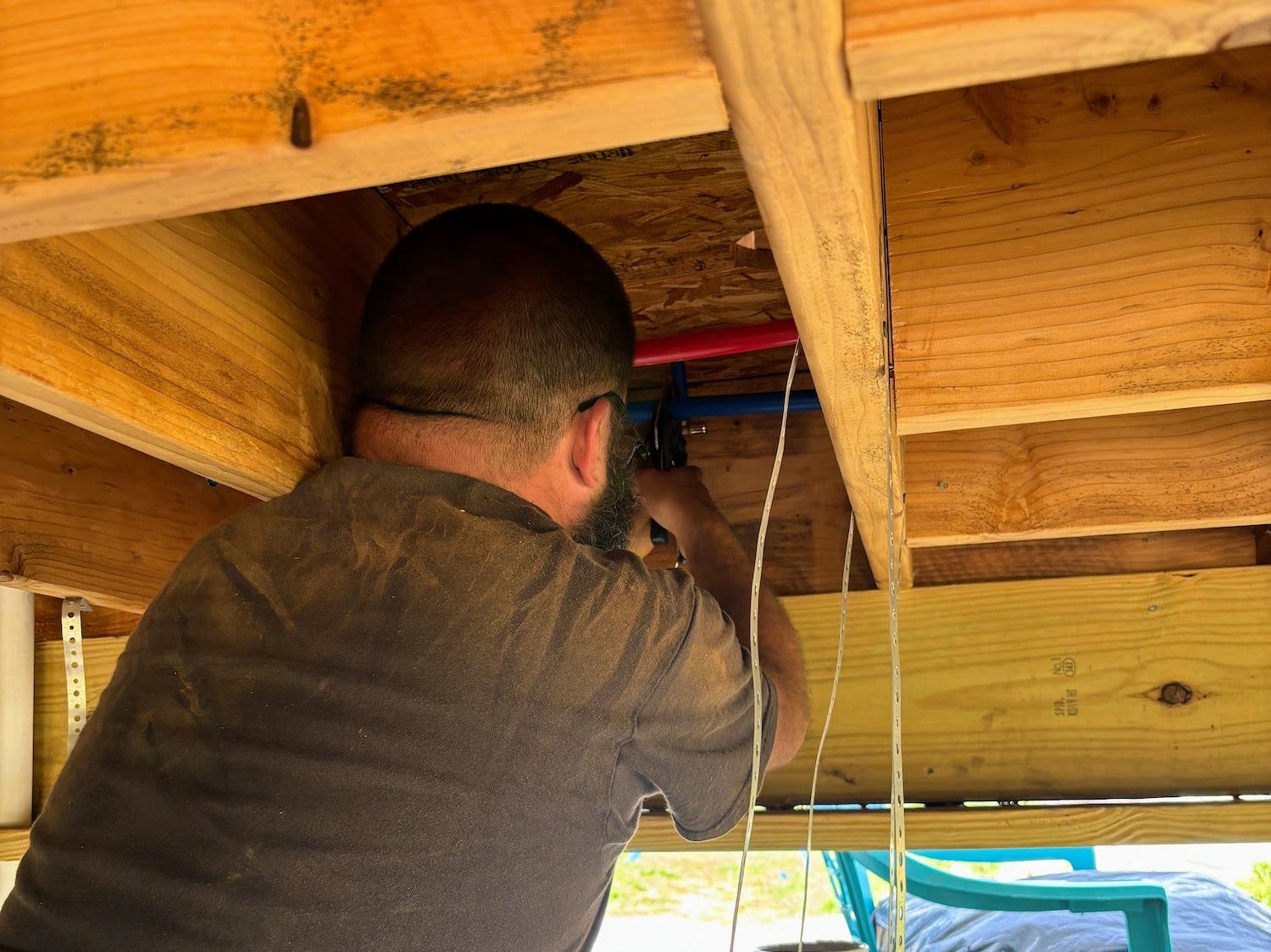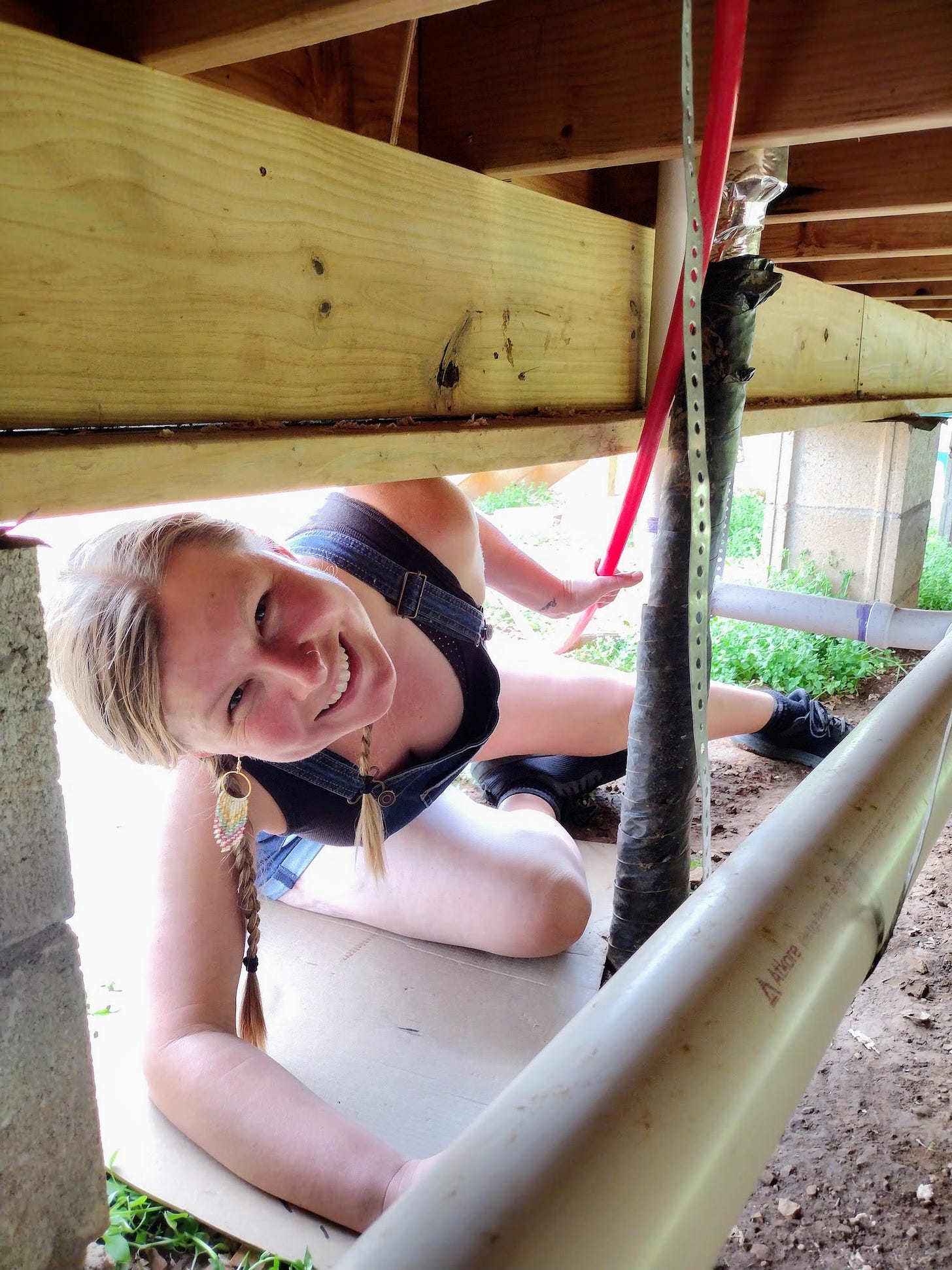 On Monday and Tuesday, Levi and Grace ran our water lines. I helped a bit when we were sliding the main trunk lines into the floor joists. Levi used PEX for his last home build, so he took the lead for this project, showing Grace how to install the flexible pipe. We were so thankful for his expertise.