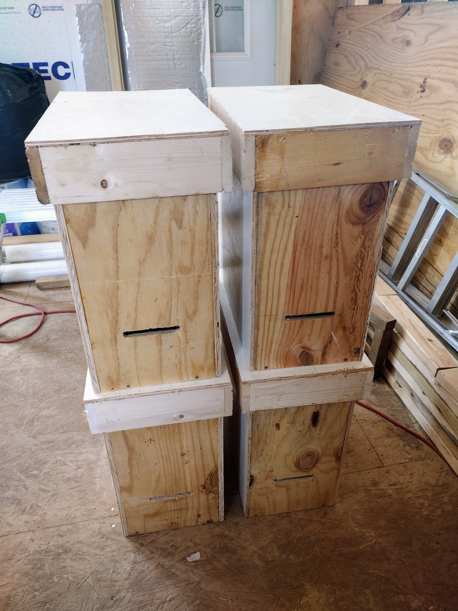 Sunday afternoon, Jeremiah and I put together four honey bee swarm traps. Jeremiah bought the family a hive for Christmas, and we planned to order bees. After watching some YouTube videos by Dr. Leo Sharashkin, an Ozark beekeeper, we decided to attempt catching a swarm instead. Jeremiah used Sharashkin's trap plans, though we altered them slightly to use mainly scrap wood we had leftover from the bunkhouse. We ordered some propolis and lemongrass to use as bait. Later in the week, I melted the propolis and rubbed it inside the traps. Grace assembled some of the Langstroth frames that came with our hive to put in the traps. All we need to do is install the metal flashing roof on the lids. We hope to get the traps hung in trees this weekend, as bees have started to swarm in our area.