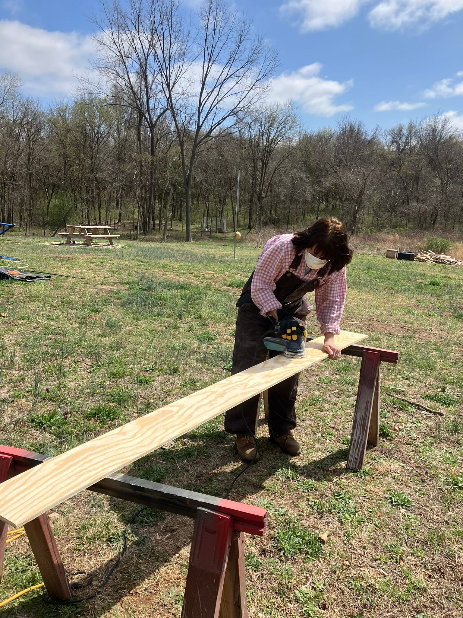 The stain had just dried when it started to rain outside -- so we hurried and brought the planks into the bunkhouse. We were thankful to have beat the wet weather. I had spent part of Tuesday moving tools and supplies around the bunkhouse, making a little room where we can work inside. The forecast showed rain and flooding from Wednesday through this weekend, so we knew cutting our boards outside just wasn't going to work.