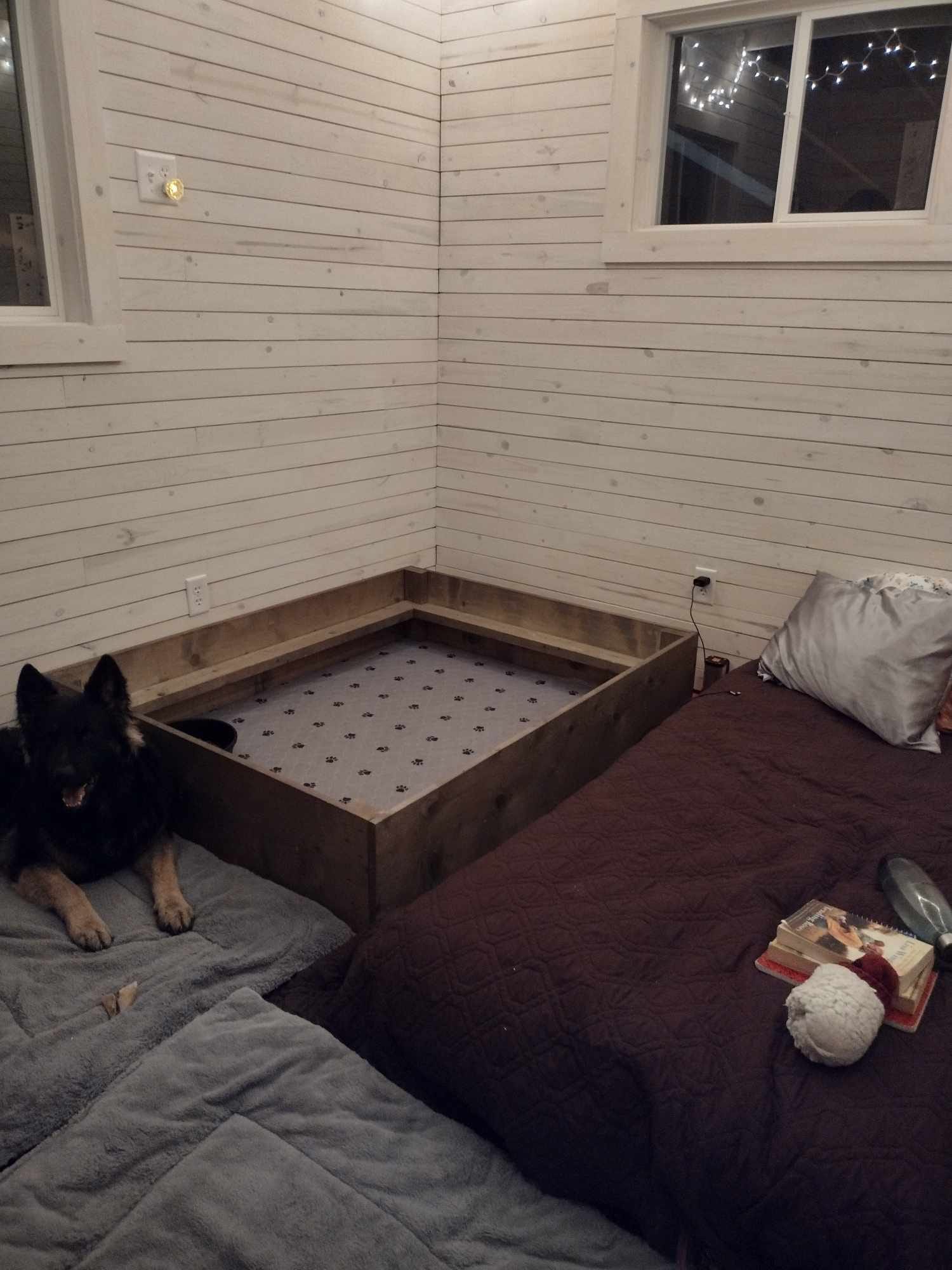 Before we began this homesteading adventure, I had a rough picture in my head of how it would go. I had a timeline. I drafted a linear progression of projects. I imagined everything coming together in a logical, orderly manner. I never saw myself finishing our strip of kitchen area before the rest of the living room so that our appliances could be delivered -- but that's what we did last fall. And I never saw myself finishing the small bedroom I will share with my sisters in two shifts, but here we are again -- completing the area beneath the loft before the rest of the room. It feels awkward and piecy, and part of my brain rebels against it, even as I nail plank after plank of flooring into place. It's not ideal. Life never is. But Bonnie-Jean's German Shepherd, Tilde, is having puppies this week, and we need a place for them to be born. The timing is crazy -- but that doesn't mean it won't be fun.