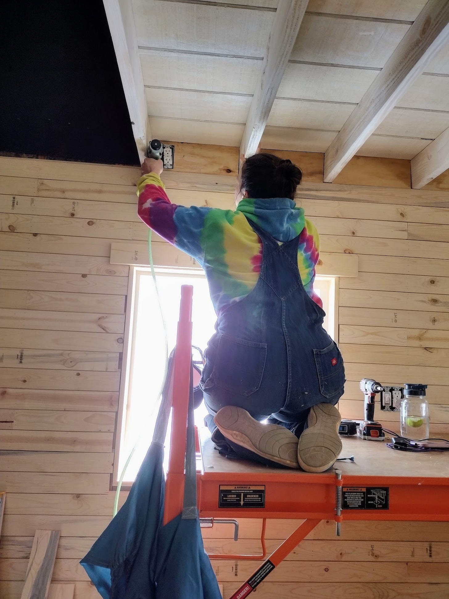 When the rain arrived in full-force on Wednesday, Grace and I spent the day inside, whitewashing the completed walls in our room. When we finished, Grace caulked the blocking under the rafters, and I helped Bonnie-Jean install hooks for twinkle lights. When we wired our room last summer, we installed an outlet up under the rafters for twinkle lights, and we put it on a light switch. While twinkle lights are usually a finishing touch to a bedroom, we installed ours right away so we could have light in our bedroom.