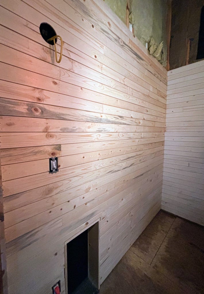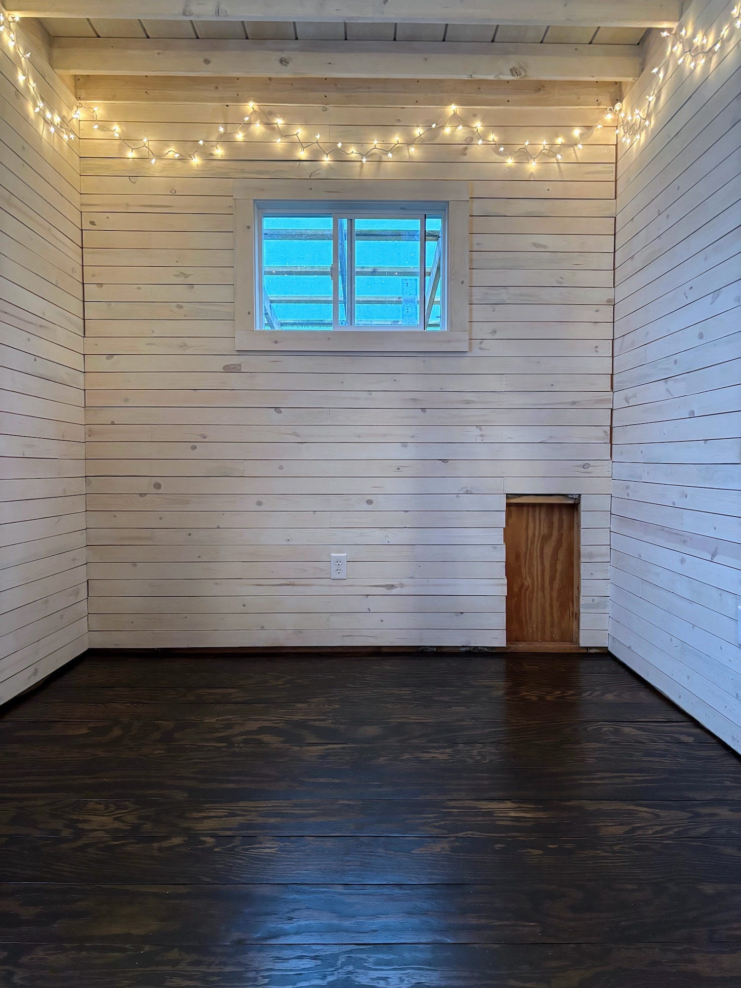 So, we began this week with a deep breath and a plunging ahead. Our focus was very much finishing a place for Tilde and her puppies. On Saturday, we picked up lumber for the flooring and trim. At home, Grace and Jeremiah finished siding the three lower walls beneath the loft.