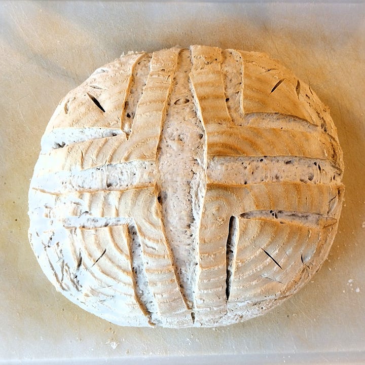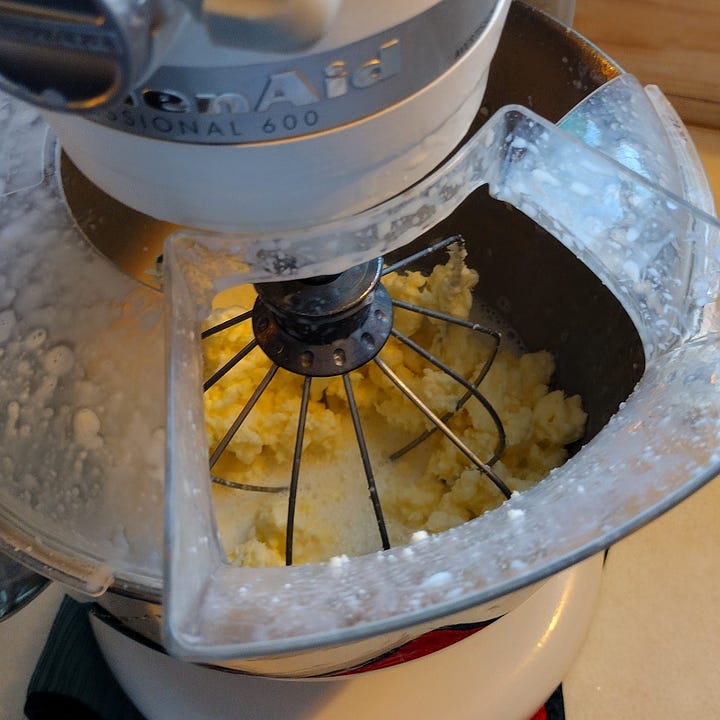We had a belated birthday celebration for Bonnie-Jean on Easter Monday. We sisters had an actual day off, which rarely happens. We started the day by making our first ever batch of European-style fermented butter. Bonnie had seen several Instagram Reels on how the butter is made, and it looked so simple, we decided to try it. We mixed a quart of heavy cream with a half cup of yogurt in a mason jar last Saturday morning, leaving it out at room temperature until Sunday night. We chilled it at that point, then whipped it until it became butter on Monday morning. The recipe called for salt, but we skipped this as Bonnie sometimes prefers unsalted butter. The result was delicious — sweet, creamy butter with the slightest tang. We served the butter on homemade sourdough bread with some cherry jam we whipped up last week. It was quite the treat.