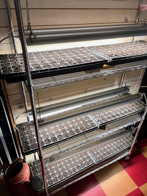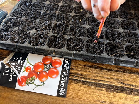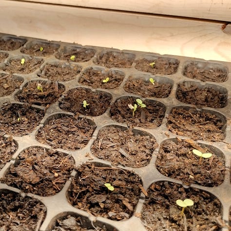 Tuesday evening, we planted six flats of seeds — each containing 72 seedlings. There is one flat of tomatoes (four varieties), one of peppers (three varieties), and another of okra (all one variety — some Clemson Spineless we had leftover from last year). We planted one flat of herbs — two varieties of basil and some cilantro. Lastly, we have two flats of flowers — two types of zinnias along with cosmos and marigolds. We kept the flats damp, and by the weekend, we had little zinnias and cosmos popping up.