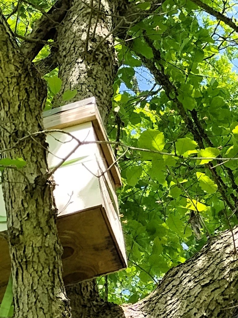 We've also been trying to find time to work on our apiary. We lost both swarms we caught last year, and we have been looking forward to trying again with new swarms this spring. We had left a couple swarm traps up from late in the season last year, and we planned to take them down and check them over this weekend. When I went to do a little reconnaissance on them yesterday, I was overjoyed to see both already have honey bees living in them. Instead of hanging swarm traps this weekend, we'll be prepping our apiary for new occupants.