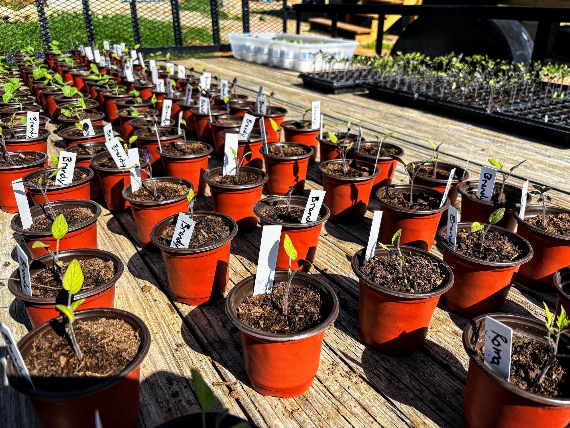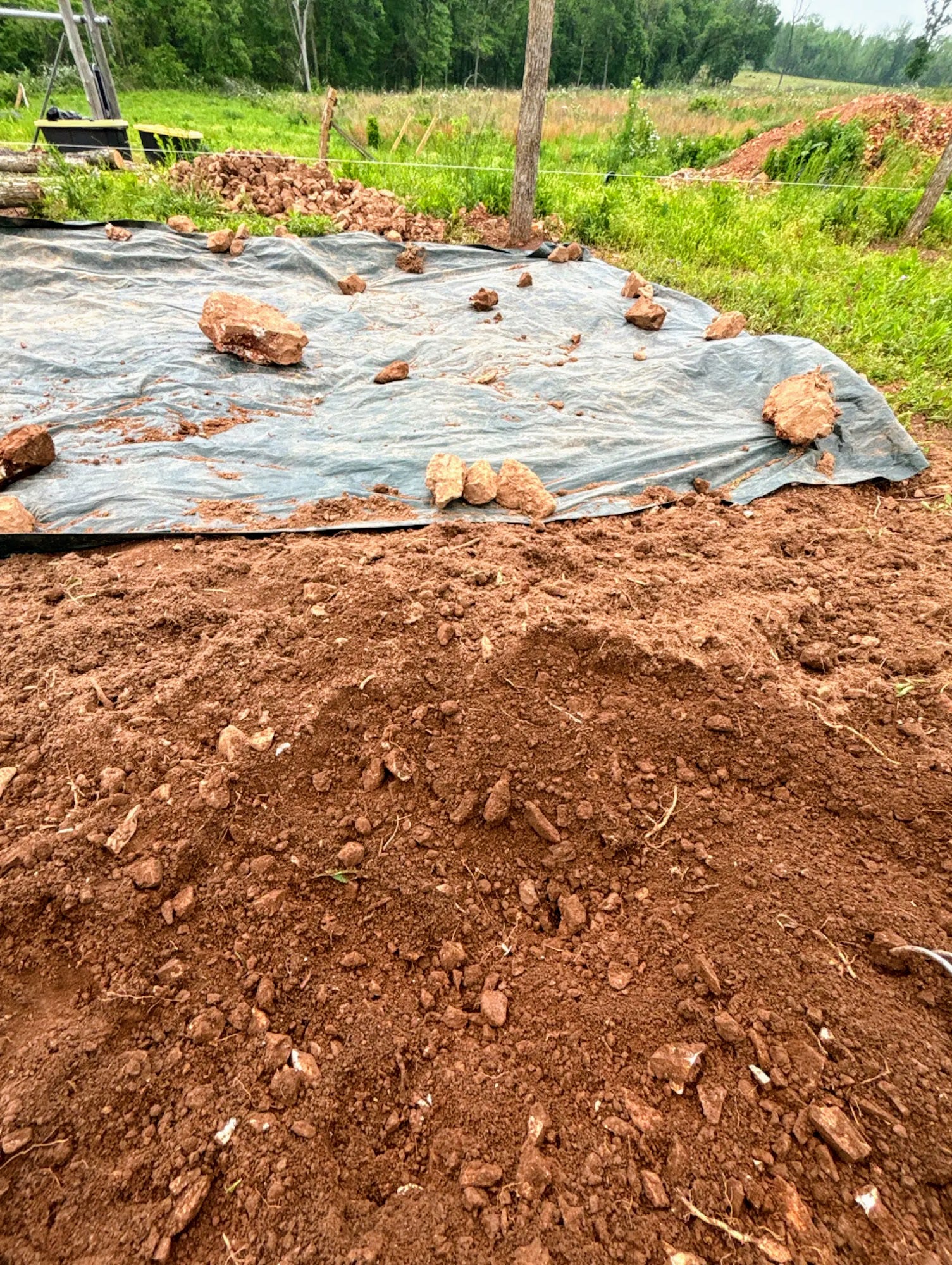 As for our plants, Bonnie-Jean and Erin babied our starts, taking them out for sun each day. Bonnie-Jean transplanted a bunch out of the trays into little pots. One day, we put down some old tarps and cardboard to keep the weeds at bay in the garden. Grace spent time breaking up the ground. The rest of us got out there whenever we could.