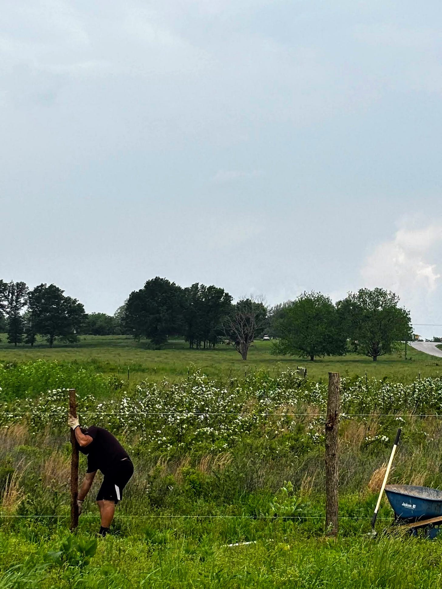 When weather and health allowed, we worked on the garden. On Saturday, Levi and Jeremiah cut some trees for fence posts. We had a bunch of posts from last year, but we needed about 16 more to finish. I helped scout out the right sorts of trees -- straight, around 6 inches in diameter, hopefully tall enough to get a couple posts out of. The guys used the chainsaw to cut them down, then they drug them up to the garden site. About an hour into our project, the chainsaw blew a hose. My dad tried to repair it, but finally had to give up. We had made a good start on the posts, but we still needed a few more trees. Jeremiah decided to get his lumber jack on, grabbed the axe, and got to work. He finished cutting down the trees by evening. Levi got busy using our big miter saw to square the ends of the posts and cut them down to the right size. Then he started setting posts -- a task he worked on daily all week.