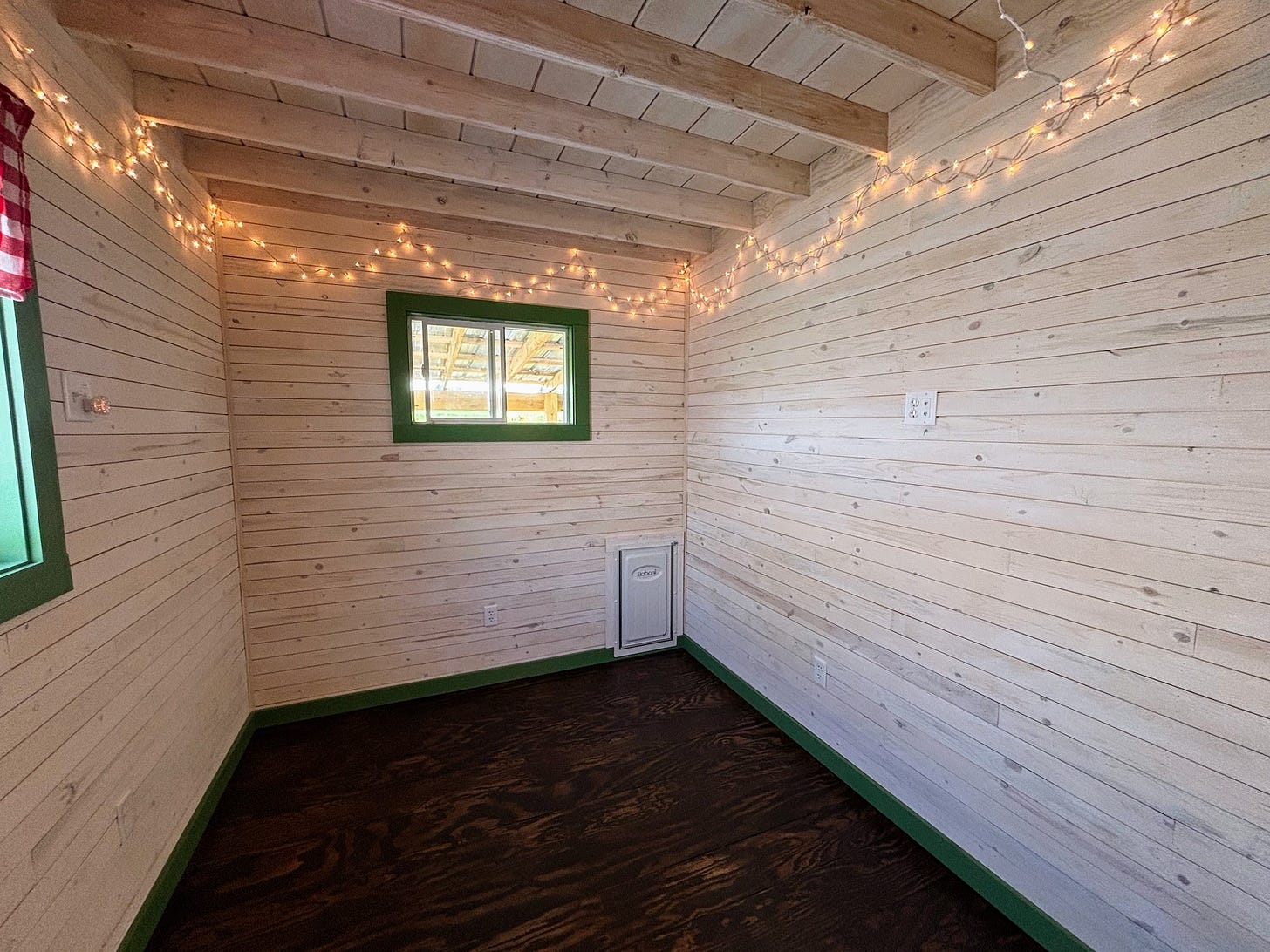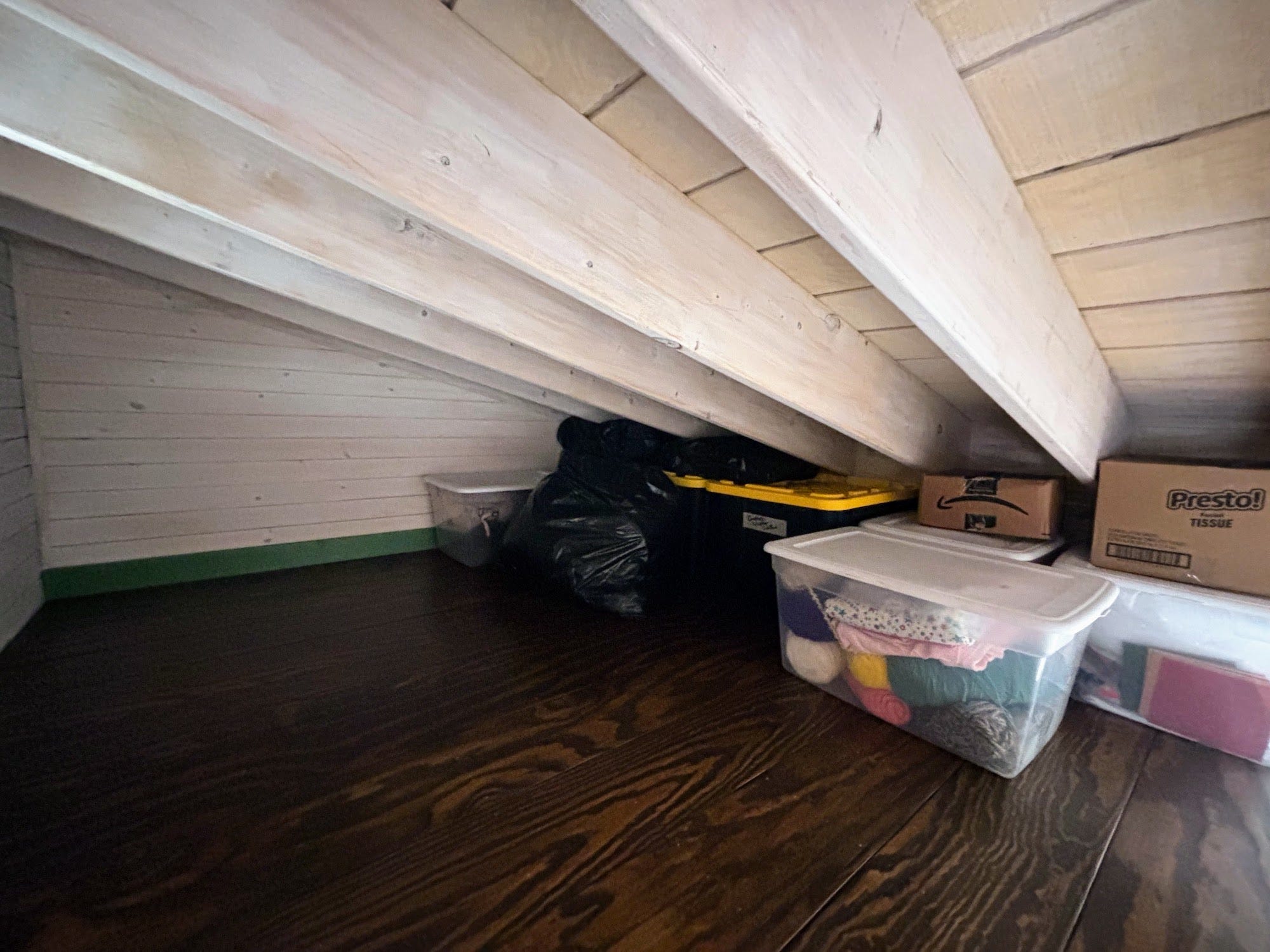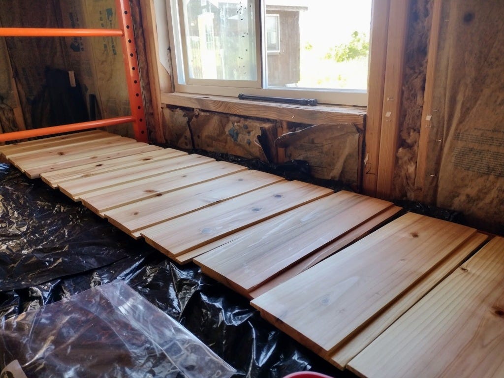 During the first part of the week, Grace and I finished up the room we sisters will share. We installed trim in our storage loft, and we moved a bunch of totes up there. We went to install the rest of the flooring in the main room, and we discovered we hadn't made enough planks. Grace and I ran outside and grabbed a couple more strips of plywood and went to work finishing them. By the end of the day, we had two more finished planks, and we installed them the next morning. We trimmed out the rest of the room and were all done by Wednesday afternoon.