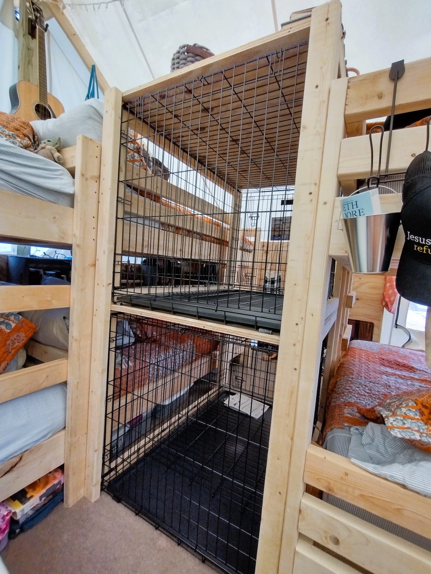 Bonnie-Jean and I worked on building some stacking dog-crate frames for our tent. As I mentioned in our previous update, she and Jeremiah have new German Shepherd puppies coming in the next few weeks, so we needed to make space for their extra-large sized dog crates. I had moments of wondering if it was possible to fit more into our tent, but by stacking our old dog crates and the new ones, we found a way. It was a fun project, and I think they will work great! Dolly and Rascal slept in theirs last night, just as cozy as can be