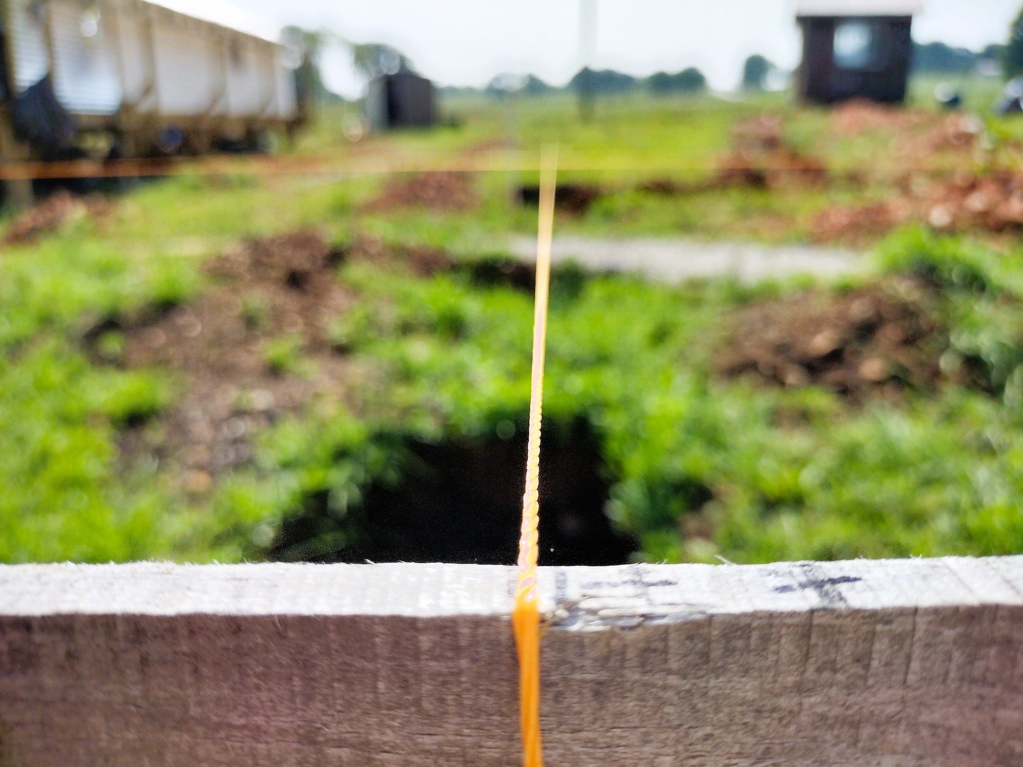 On Monday, Levi and I used our new Huepar 360-degree line level to adjust our batter boards and put our stringline back up. It was too bright outside to use the line, but thankfully our level has a pulse mode. We had purchased a laser receiver, so we used that to level our boards.