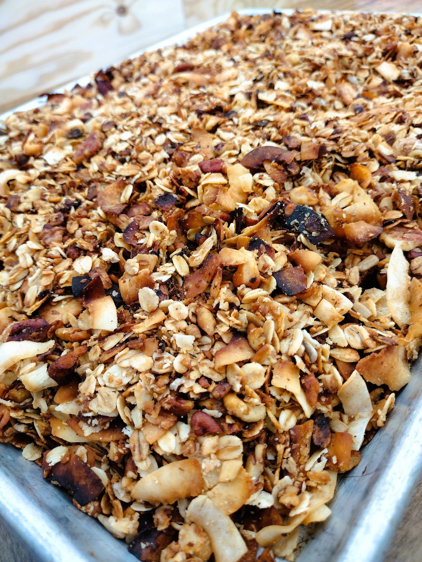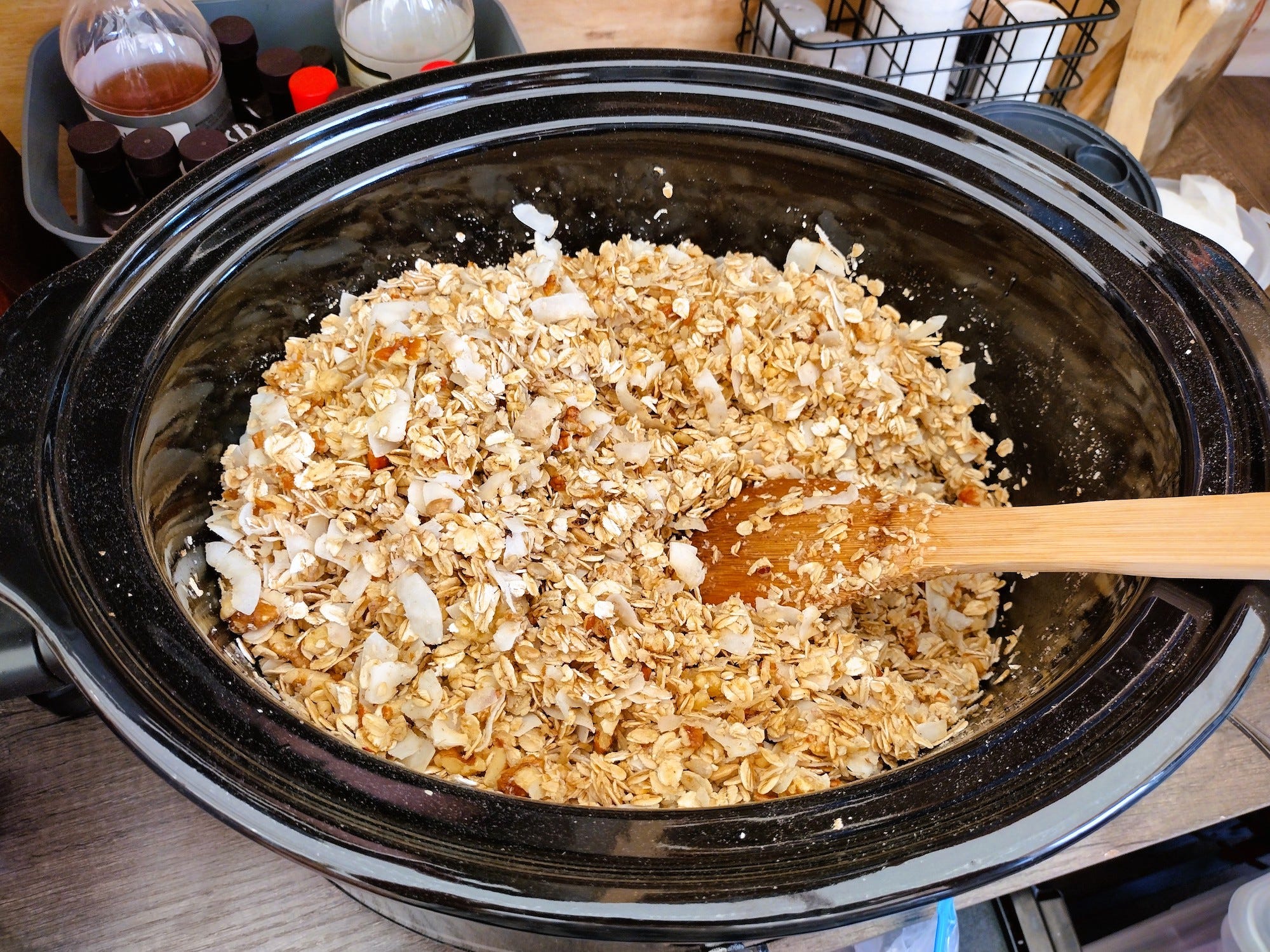 It rained most of Saturday, which meant we took a break from our regular projects. I took the opportunity to try a new recipe for slow-cooker granola. I love granola and prefer making it myself since I can control the sugar content. I adapted this recipe to use part honey and part erythritol. I was impressed with the result. I can't say it is quite as crisp as oven-baked granola, but for the situation we are in, I'm thrilled with the results!