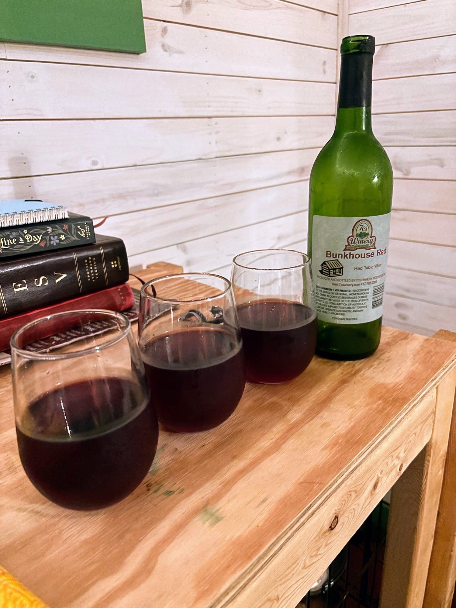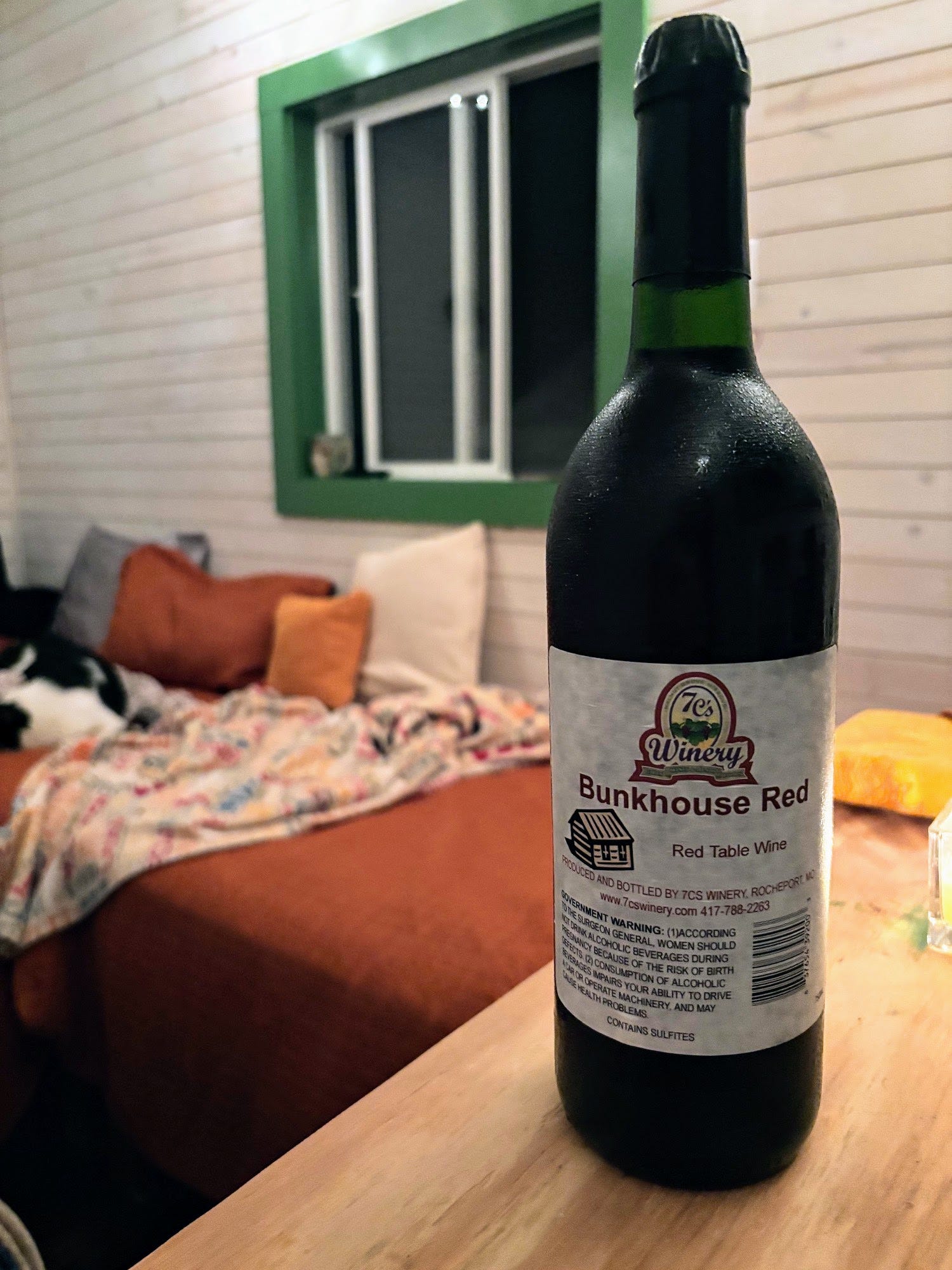Before crawling into our newly made beds, we uncorked some wine we've been saving for nearly two years -- a bottle of "Bunkhouse Red" from the local 7C's Winery. During our visit to 7C's during their 2023 Meadfest, we sampled their Bunkhouse Red at a wine tasting. It was delicious, and with a name like that, we just had to buy a bottle. We decided we'd save it for our first night in the bunkhouse, little knowing it would take us nearly two years to get there.