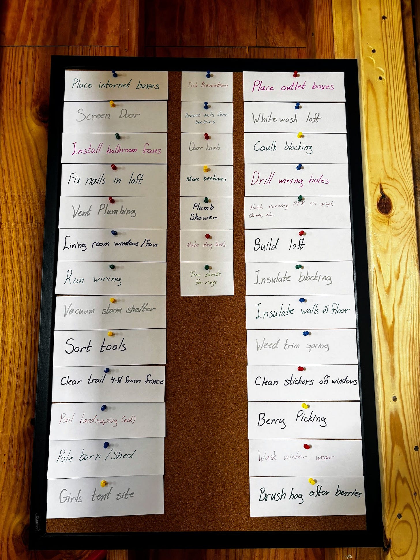 We did make some progress on our homestead. We've stayed busy in the garden, with our sister-in-law Erin putting in lots of extra hours there this week. We now have okra as well as a few melons planted. We did some major cleaning and rearranging of our wall tent for the summer, moving our big dog crates to the front porch where it is cooler in the evenings. In the bunkhouse, our dad and brother Levi installed the front door. One afternoon, I helped the guys get most of our outlet boxes installed. We also put together a task board to keep all of the various jobs around here organized. With so many people helping with so many different things, we've had a few tasks get forgotten. We hope our new system will make us more efficient. Lastly, three of our five kittens went to new homes this week. Just two more to go!