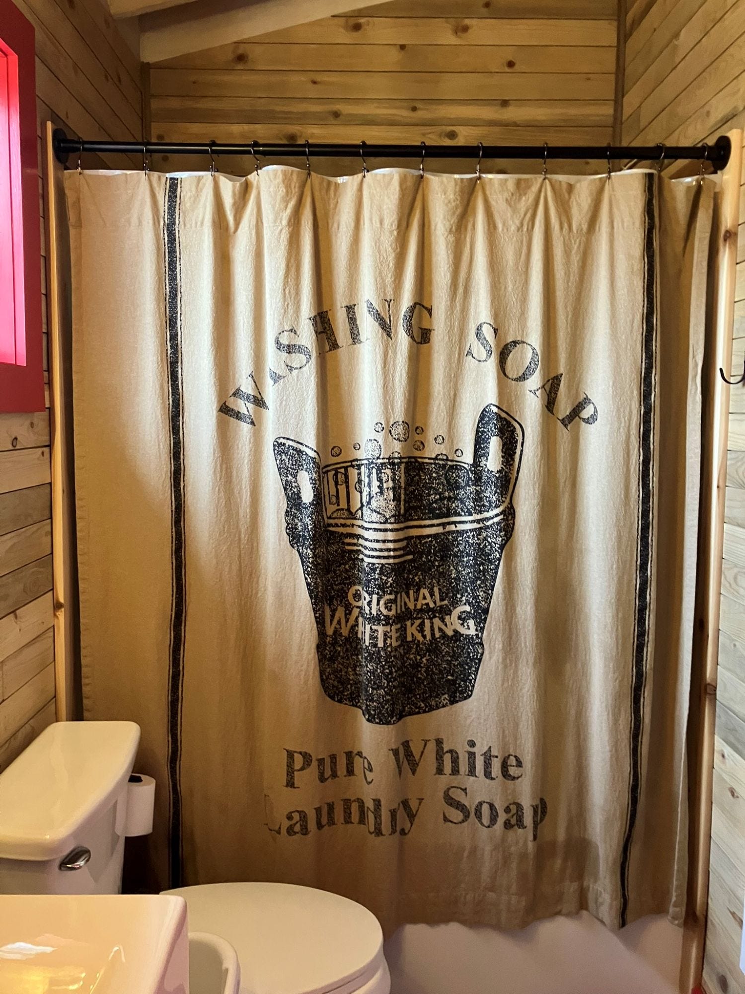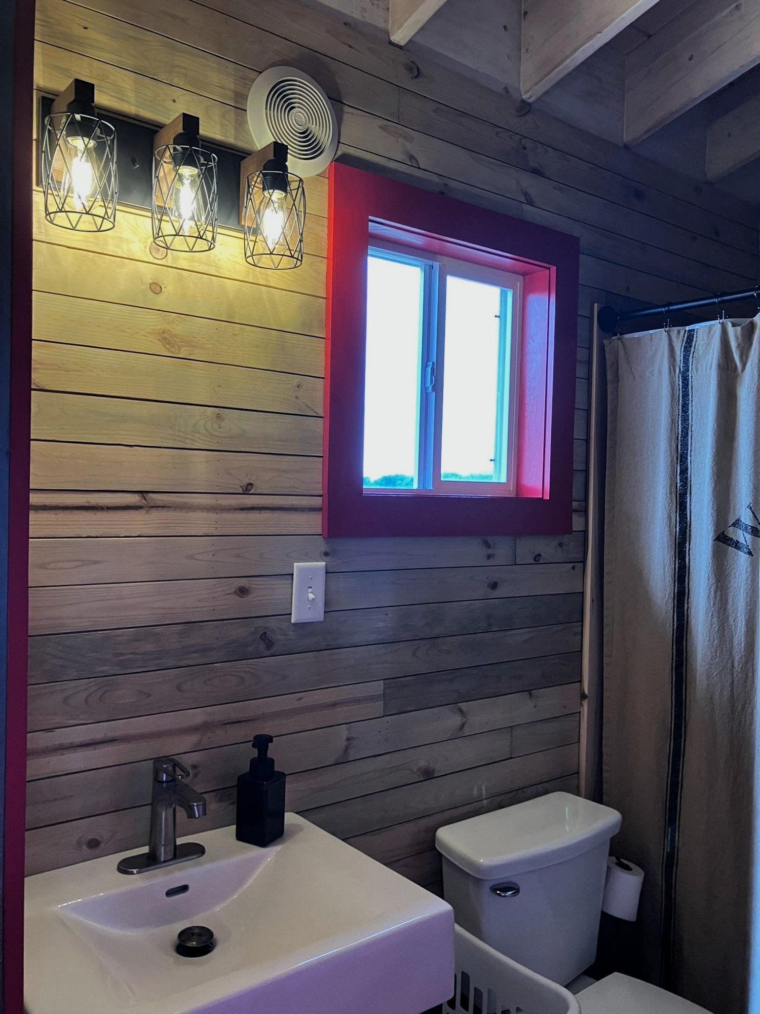 We also finished our full bathroom. Our dad installed our new vanity light. Our outlet box ended up off-center, so we had to choose a more forgiving light model than the one we originally installed. Levi and I reinstalled the painted bathroom door. Levi plumbed the shower, and Grace added the final caulking around the bathtub. On Tuesday, I put up our shower curtain and installed some towel hooks. I took the first indoor-shower that evening. It was surreal, standing under water flowing through pipes I helped install, in a bathtub I helped purchase, over a floor I helped lay, above joists and blocking I helped cut. Having a fully-functional indoor bathroom makes the bunkhouse feel so much more completed, even though we still have a couple rooms to finish.