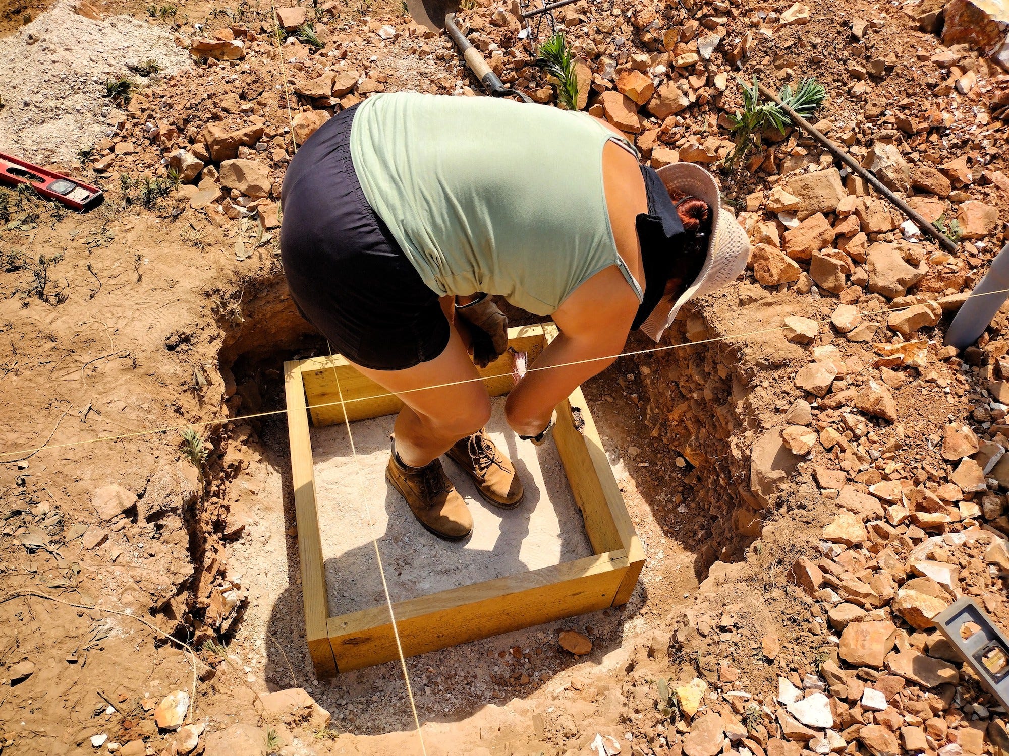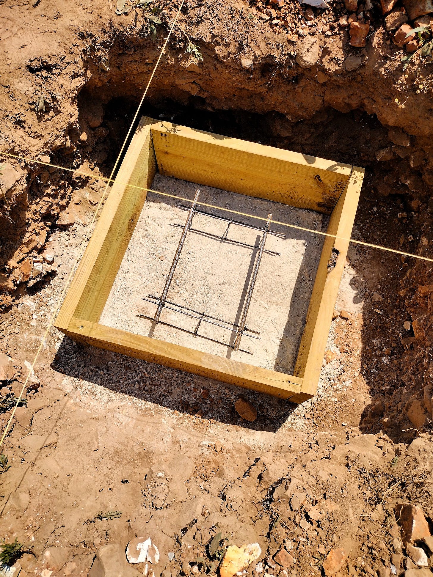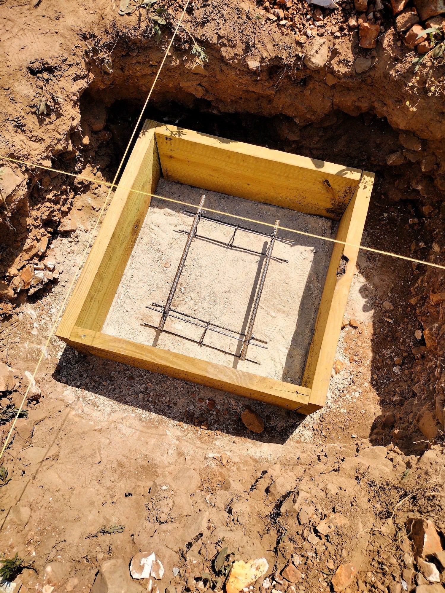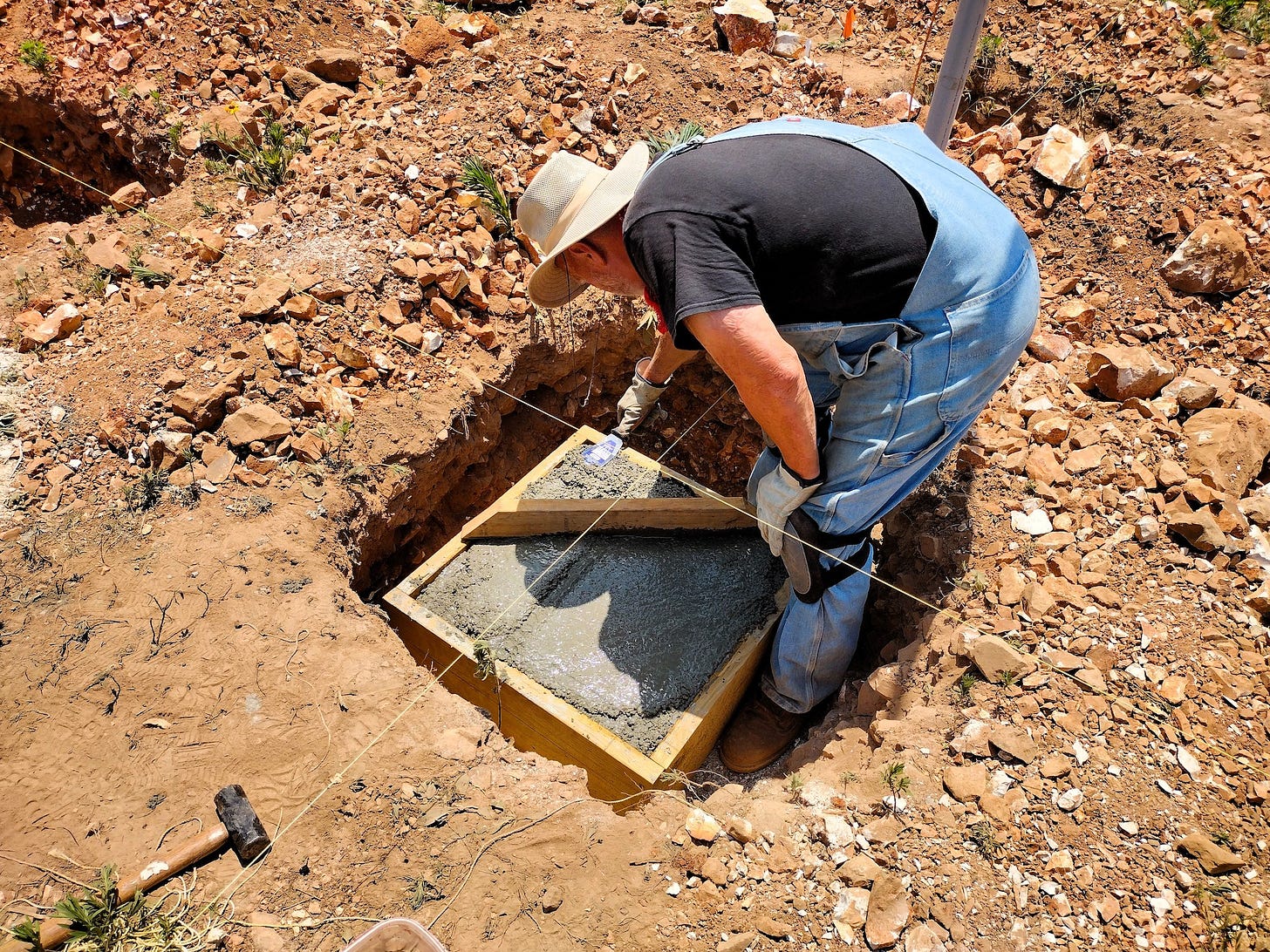 On Friday, we poured our first footing. It took us half a day, as we had some bugs to work out. It was very tricky, getting the footing frame level and in exactly the right place in the hole. Dad and Levi helped chip out a little more rock to level the frame. Then, Bonnie-Jean, Dad, and I worked on installing the rebar and pouring the cement. It was kind of surreal, after all this effort, to be actually building our bunkhouse.