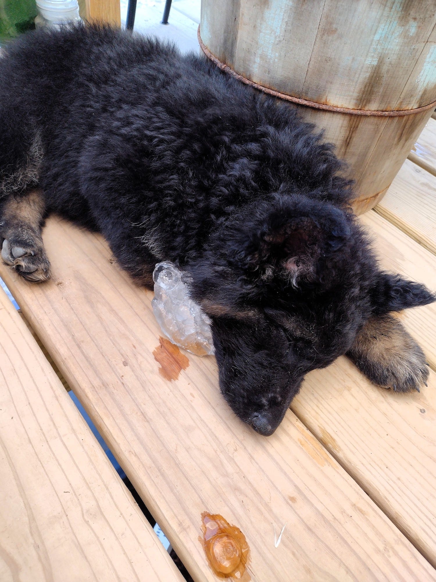 In an effort to help the puppy stay cool, we introduced Dagger to ice this week. He got very excited, but quickly decided he preferred to cuddle it. He spends most of his days in his master's air-conditioned office, so he is handling the heat better than most of us. But when he is out, he enjoys playing in our mister or snuggling an ice pack.