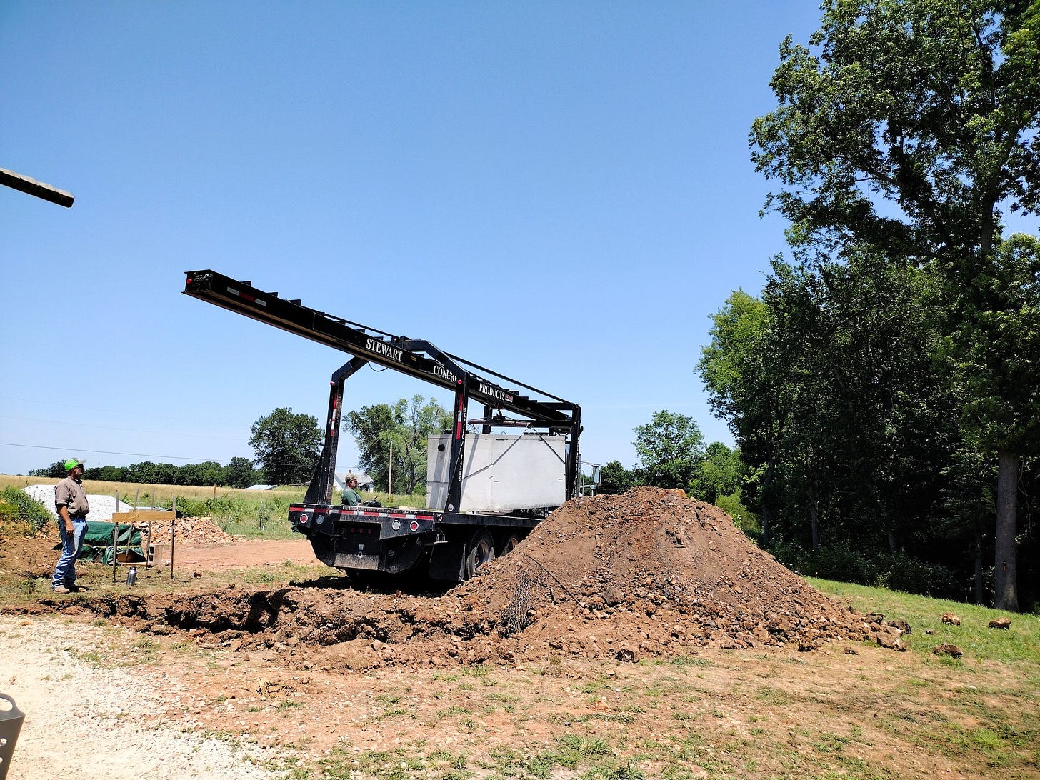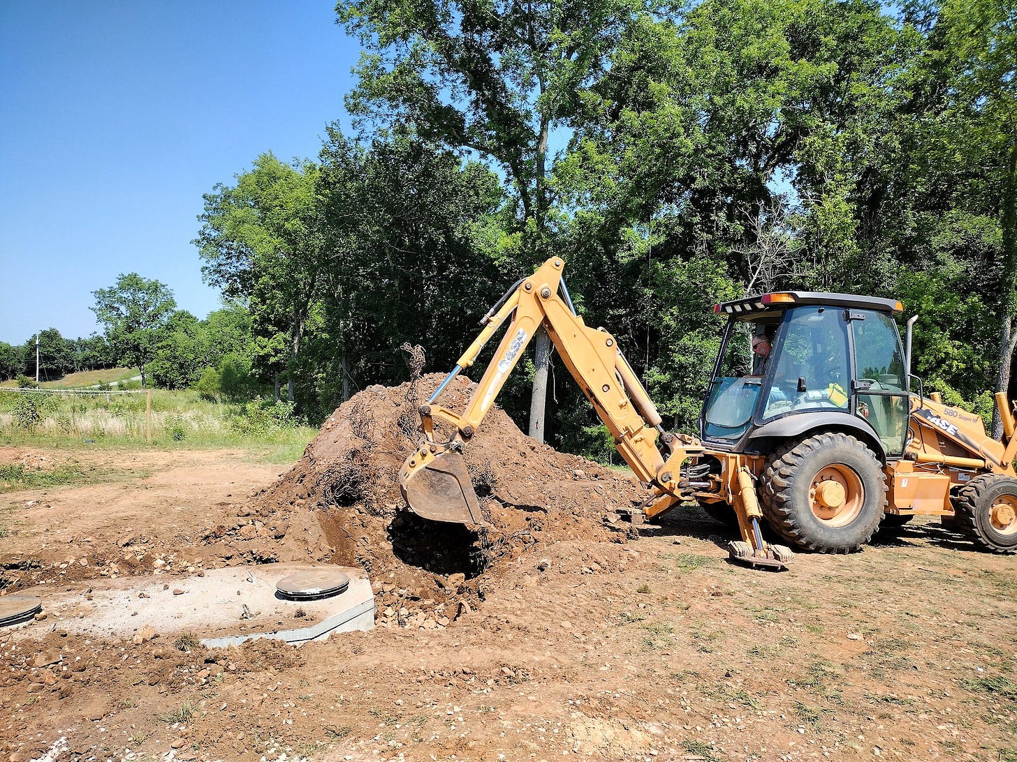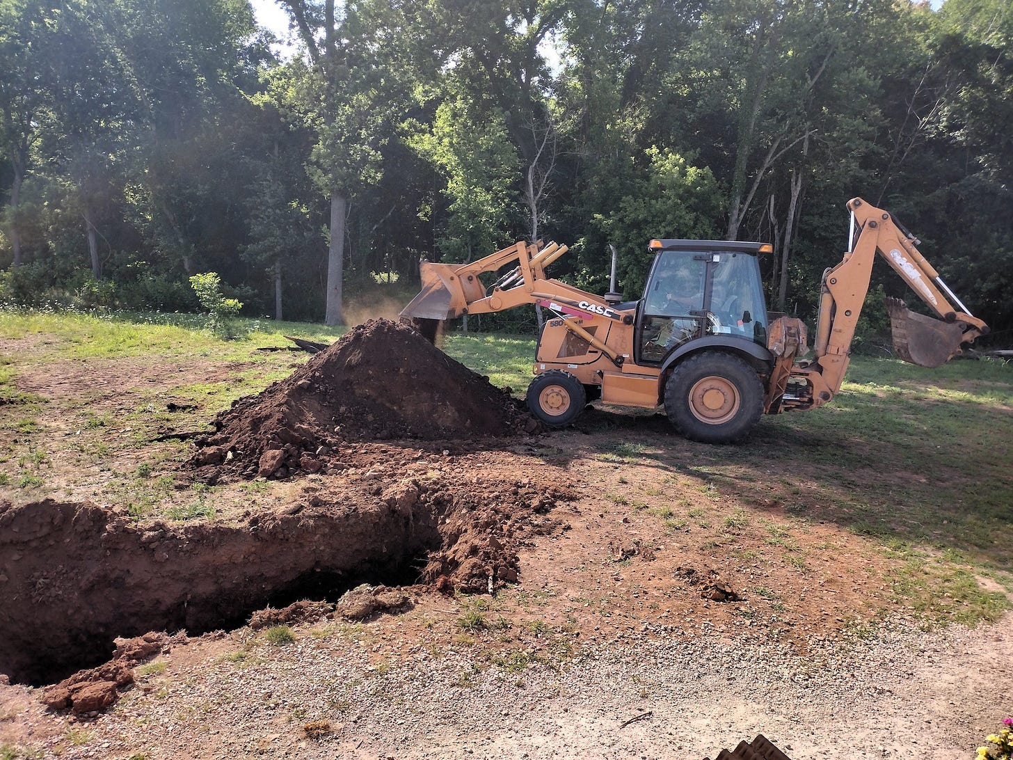 Aside from the heat, our big news for the week is our new septic system. David Davis started installing it this week. He put the tank in on Thursday, then he started on the leach field on Friday. He will be back next week to finish up. Due to the heat, he only worked part of the day Friday -- and we understood. We had to quit around the same time and seek refuge in the shade.