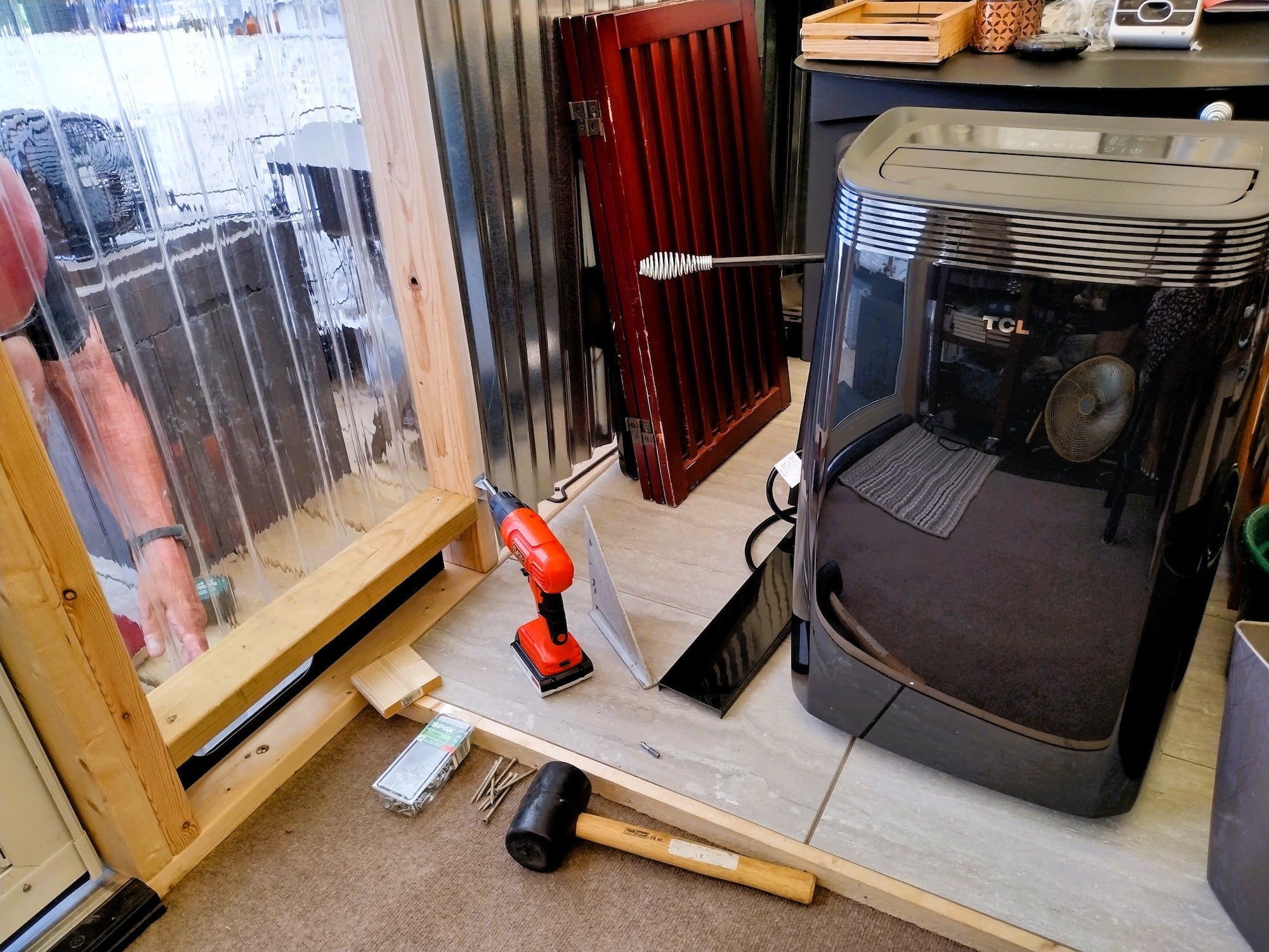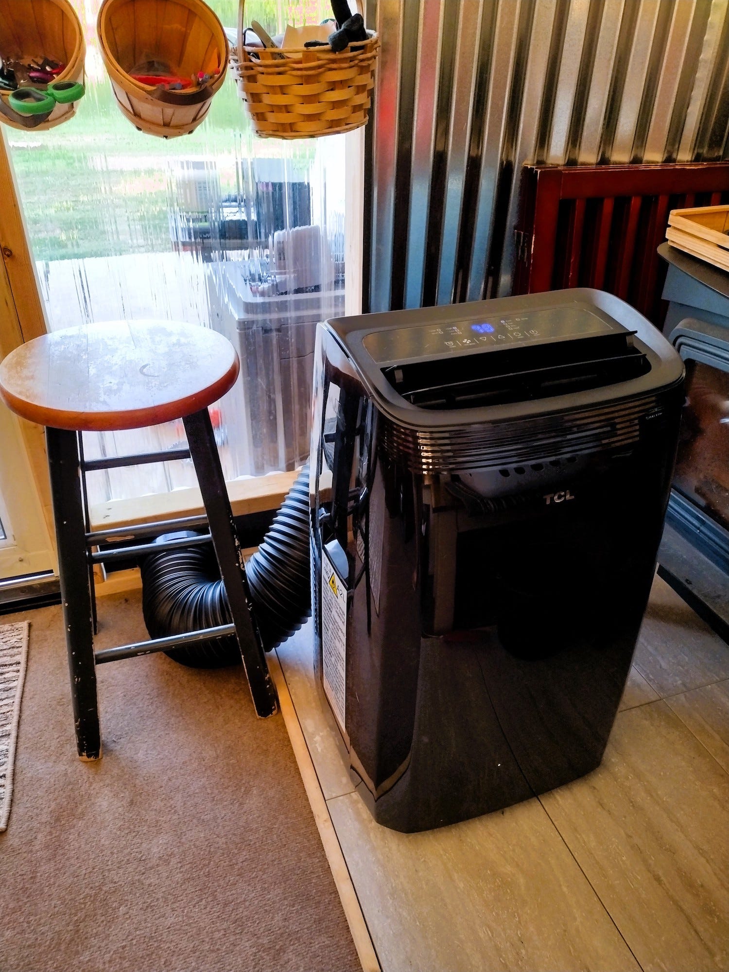 The heat was oppressive this week. We started really feeling it Saturday night, when the tent just would not cool off. It always takes awhile to cool off inside at night, even after it has cooled off outside. We have been brainstorming what to do about it. We considered setting up an alternative summer camp back near our spring where we camped last year, but we like being in our real beds. After a miserably hot Saturday night, we started to feel desperate. When a few of us ventured out on Sunday to pick up some groceries, we decided to pick up an air conditioning unit. We read that some people with canvas tents use them with great success, so we thought we would give it a try. We planned to just use it when necessary in the evening.